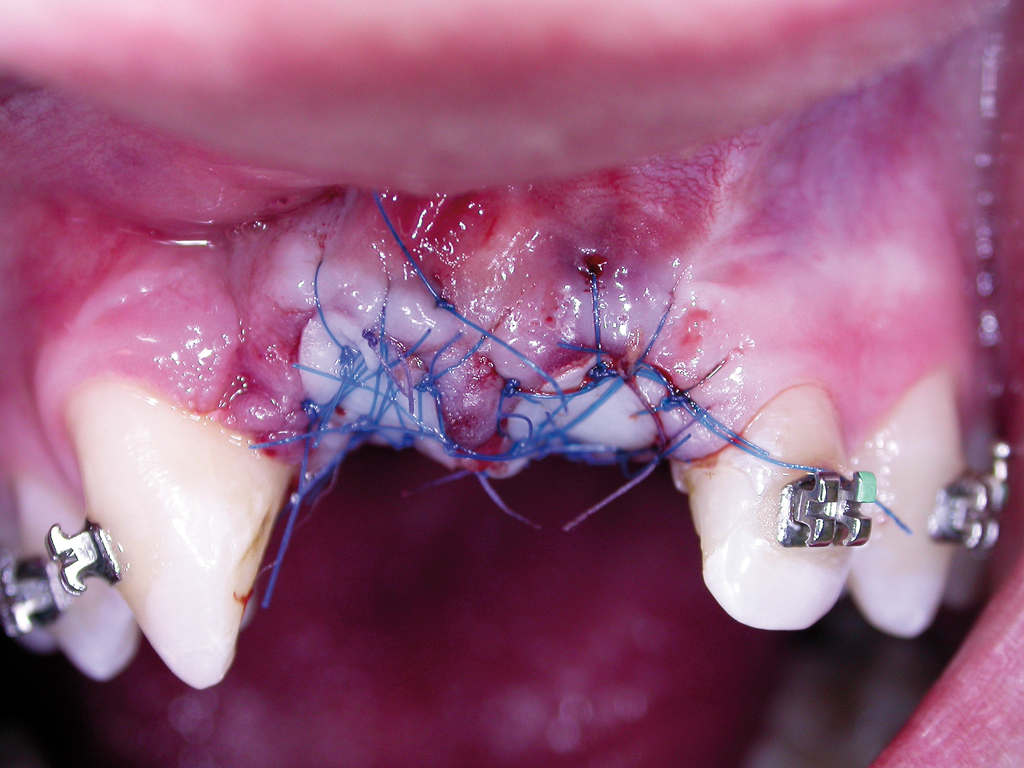 Zębodoły poekstrakcyjne zamknięte szczelnie tkanką miękką pobraną z podniebienia.