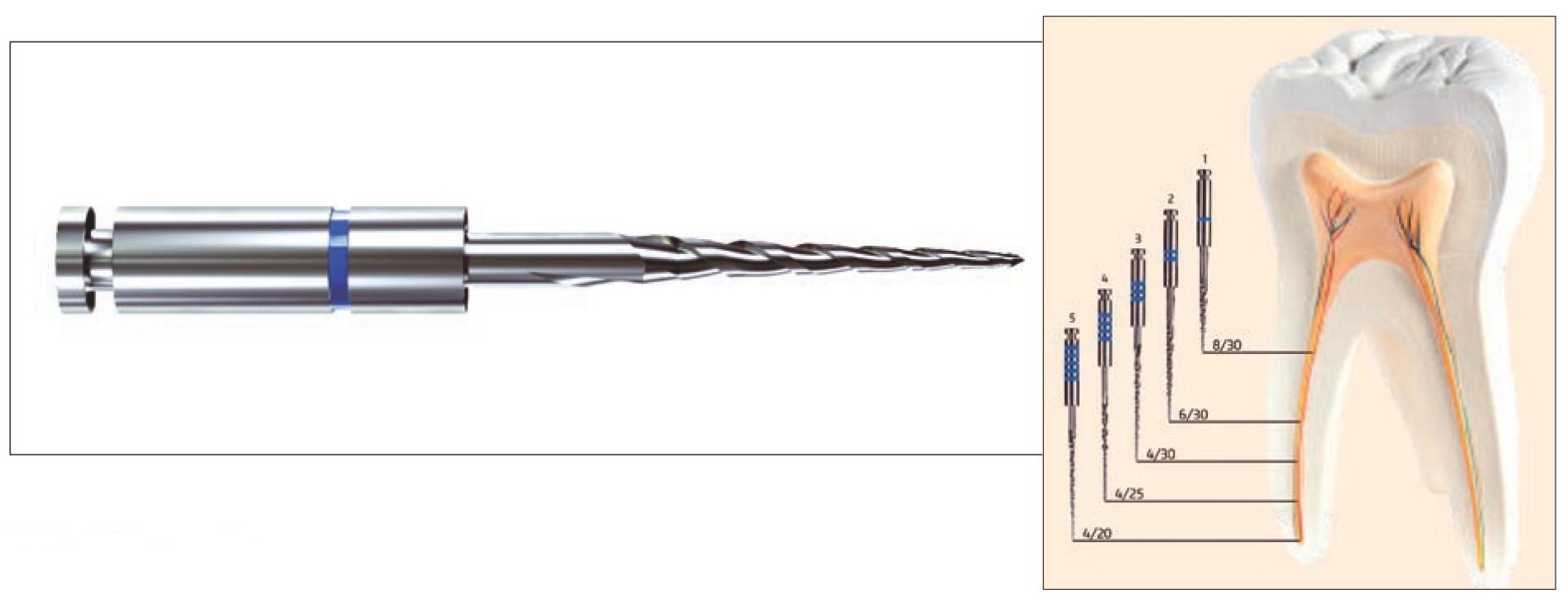 Rzeczywiście, w momencie pojawienia się rotacyjnych narzędzi niklowo-tytanowych stosowanie wierteł Gatesa-Gliddena stało się mniej powszechne. Pewne ich funkcje przejęły narzędzia NiTi, stosowane jako pierwsze do poszerzenia części koronowej kanału. Są to instrumenty krótsze od tych używanych do opracowania głębszych odcinków kanału i zazwyczaj bardziej stożkowate (o większej koniczności). W przypadku niektórych rotacyjnych systemów NiTi noszą one nazwy świadczące o tej funkcji, np. w systemie ProFile są określane jako Orifice Shaper, w przypadku systemu FlexMaster używa się nazwy Intro File, choć większość producentów po prostu określa je jako pierwsze narzędzie, którego należy użyć do opracowania kanału (tzn. ujścia kanałowego i jego części koronowej) (ryc. 1).