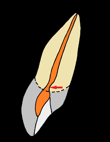 Ryc. 2. Wypukłość podniebienna w zębie siecznym przyśrodkowym (strzałka czerwona).