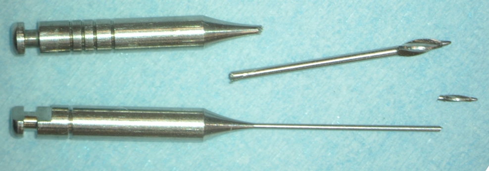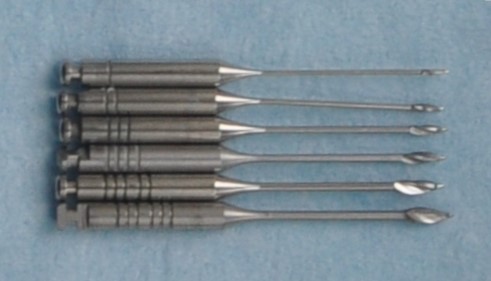 Wiertła wykonane są ze stali nierdzewnej i produkowane w dwu długościach: 32 i 28 mm (długości trzonka wynoszą odpowiednio 19 i 15 mm) i sześciu rozmiarach (ryc. 5, tab. I).