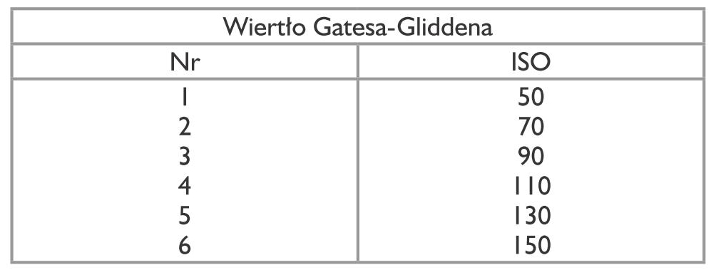 TABELA I. Rozmiary wierteł Gatesa-Gliddena.