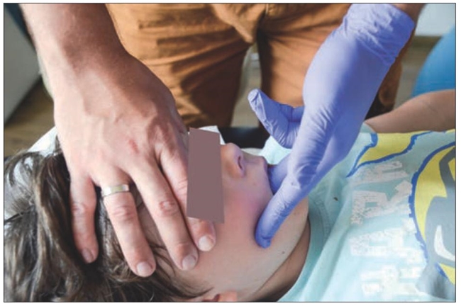 Fig. 4. Freeing up restrictions at the vomer.Because during CST tension is released which often had been retained in the patient’s body for many years, involuntary movements or emotional reactions may occur and they are considered to be a part of the therapeutic process. The patient may change his/her body position on the table, which facilitates the release of tension from the fascial system.