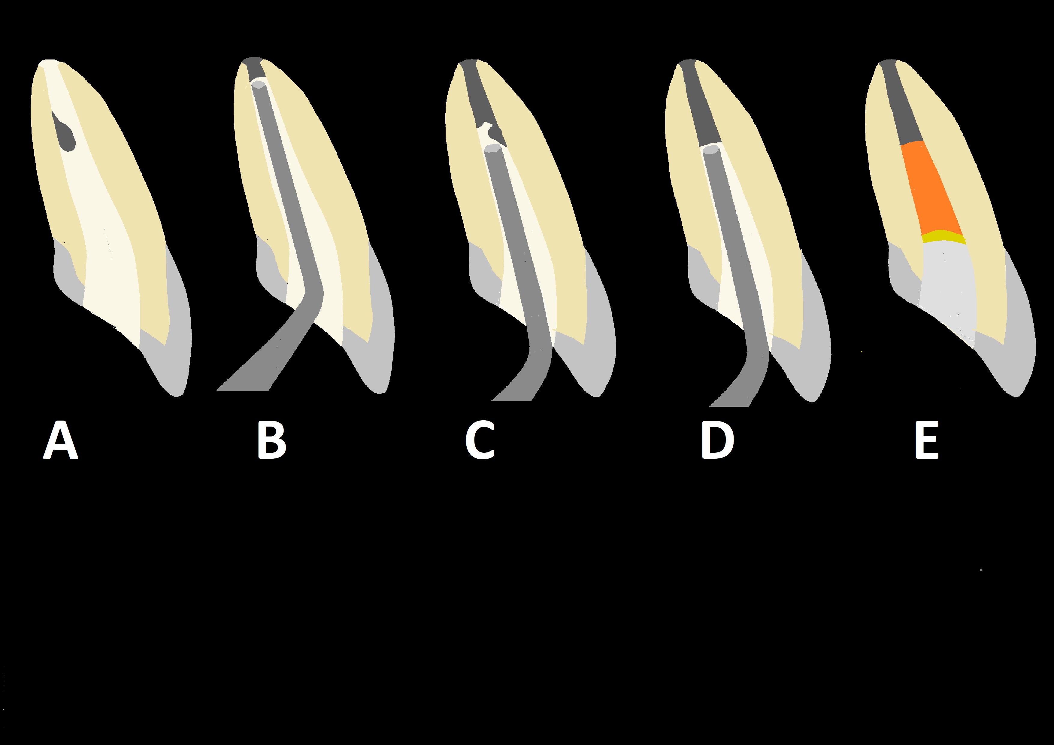 Ryc. 1. Wypełnienie części wierzchołkowej kanału materiałem bioceramicznym (zabieg wykonania „korka”): A. aplikacja pierwszej porcji materiału do kanału; B. kondensacja pierwszej porcji materiału w okolicy otworu wierzchołkowego; C. kondensacja ostatniej porcji materiału; D. kanał wypełniony materiałem bioceramicznym na długości 4-5 mm; E. stan po wypełnieniu części środkowej i koronowej kanału oraz dotworzeniu ubytku w koronie zęba.