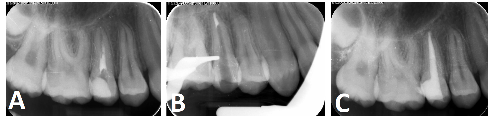 Ryc. 2. Ząb 15 leczony endodontycznie (otwór wierzchołkowy o rozmiarze 100): A. zdjęcie rentgenowskie wykonane w trakcie leczenia, w kanale widoczny materiał zawierający jodoform; B. zdjęcie rentgenowskie wykonane po wypełnieniu części wierzchołkowej preparatem Well-Root PT; C. zdjęcie rentgenowskie po wypełnieniu części środkowej i koronowej kanału.