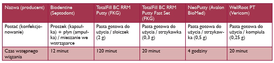 • względnie preparaty w postaci jednej pasty niewymagające mieszania np. iRoot BC RRM Putty (Innovative BioCeramix), EndoSequence BC RRM Putty (Brassler), TotalFill BC RRM Putty (FKG), Well-Root PT (Vericom), Bio-C Repair (Angelus).
