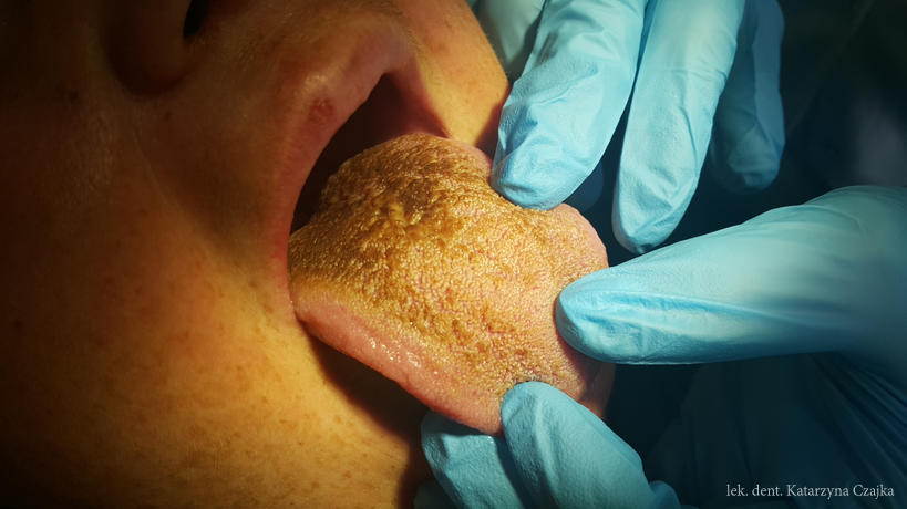 Przedstawiony opis przypadku sugeruje obecność języka czarnego włochatego (lingua villosa nigra), a jego pojawienie się u prezentowanego pacjenta może mieć związek z kilkoma czynnikami. Patologia ta jest łagodną zmianą charakteryzującą się odmiennym zabarwieniem i fakturą grzbietowej powierzchni języka, która może przybierać kolor od zielono-żółtego po brązowo-czarny. Za zmianę zabarwienia odpowiedzialne są zmiany w ekosystemie na korzyść chromogennych bakterii produkujących porfi ryny lub drożdżaków. Zabarwienie może być również skutkiem kumulowania się na zajętym obszarze barwników pokarmowych. Wnikliwe badanie kliniczne ujawnia obecność wydłużonych brodawek nitkowatych przypominających włosy. Ich obecność uwarunkowana jest zaburzeniami w złuszczaniu – hiperkeratozą nabłonka brodawek nitkowatych, co powoduje ich wydłużenie nawet do około 12 mm, podczas gdy w warunkach prawidłowych mierzą one około 1 mm. Tak zmienione środowisko sprzyja rozwojowi wspomnianych wcześniej bakterii poprzez tworzenie obszarów retencyjnych dla resztek pożywienia, które ulegają fermentacji (1, 2).