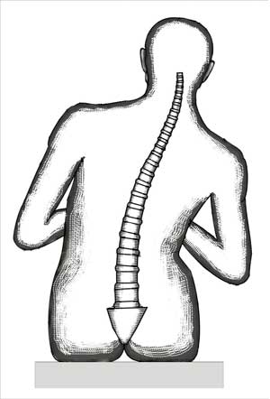 Ryc. 3. Rola mięśni kręgosłupa sprowadza się do utrzymania równowagi i przenoszenia sił podczas chodu. Ruchy chwiejne są wymuszone przez poruszającą się „podstawę” – kość krzyżową połączoną z kośćmi miednicy.