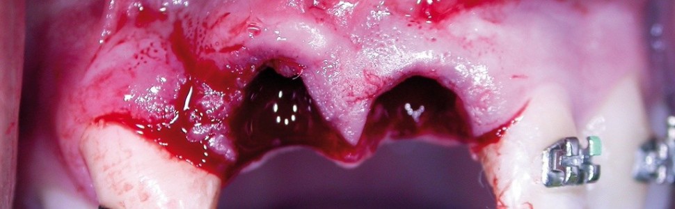 Zębodoły poekstrakcyjne zamknięte szczelnie tkanką miękką pobraną z podniebienia.