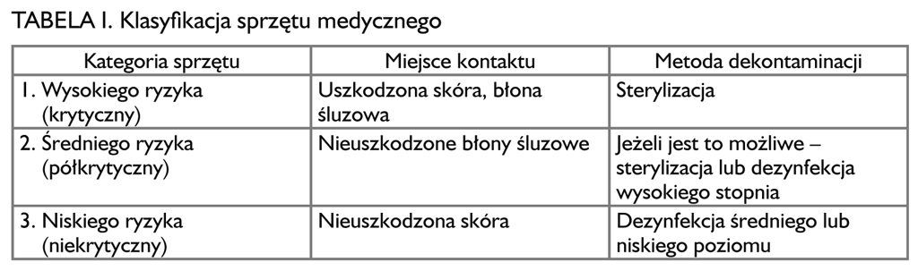 - Niekrytyczny – niskiego ryzyka, wchodzi w kontakt jedynie z nieuszkodzoną skórą, dezynfekcja średniego, niskiego poziomu (tab. I).