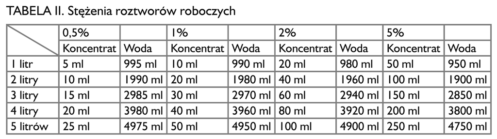 - Użytkownik jest odpowiedzialny za sporządzenie roztworu o prawidłowym stężeniu i stosowanie preparatu zgodnie z zaleceniami producenta.