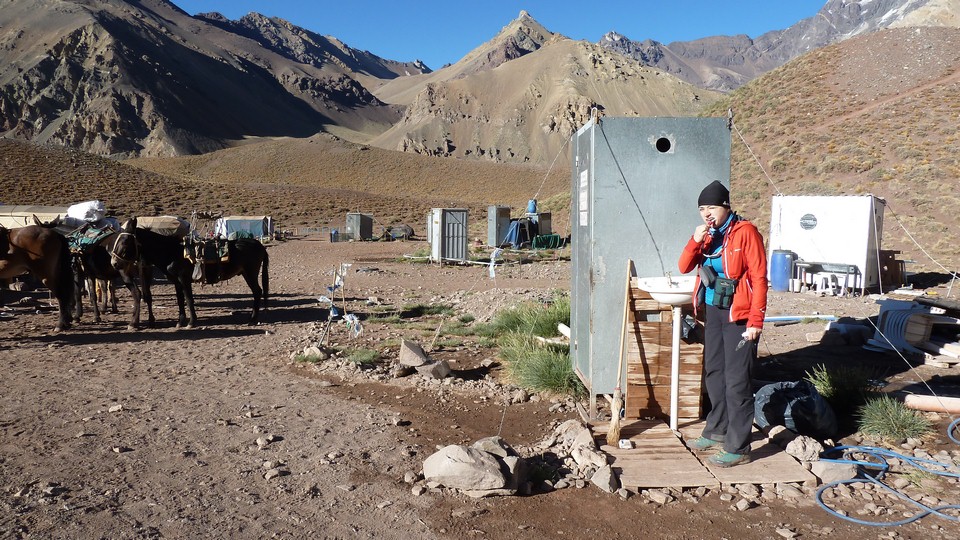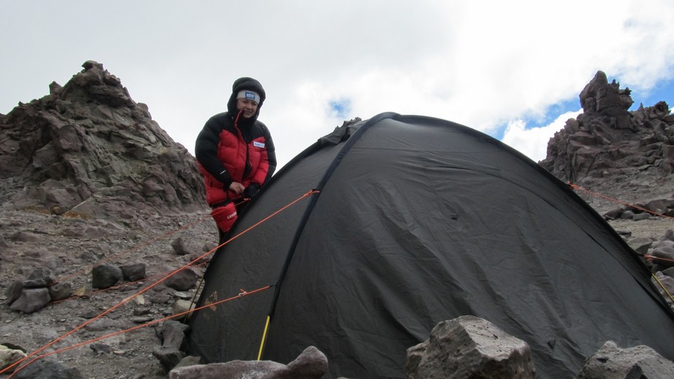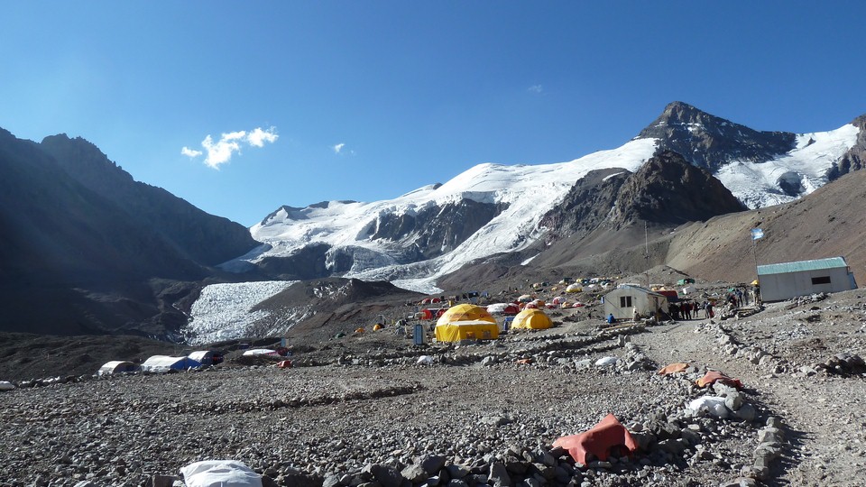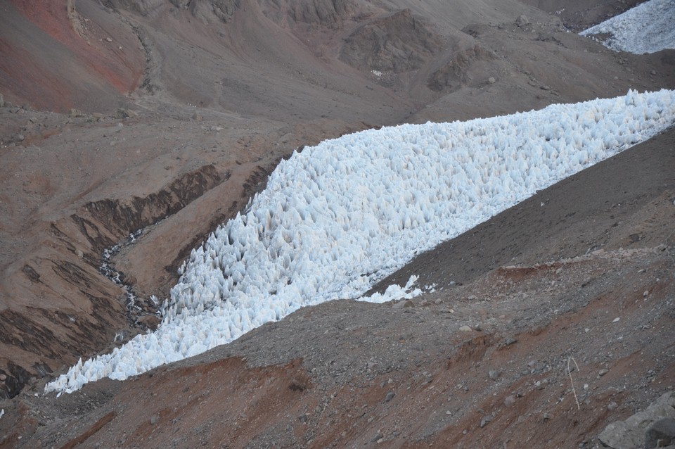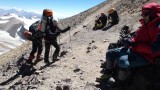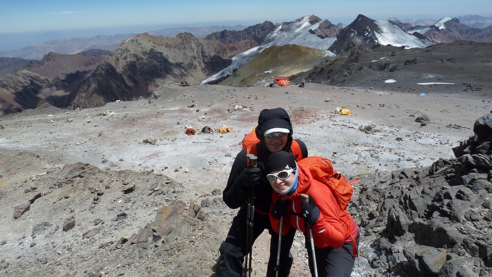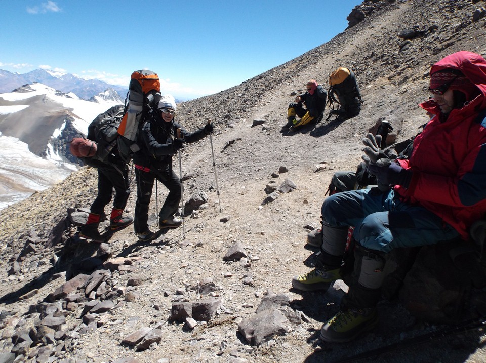 Kolejnego dnia rankiem poszliśmy w górę. Nieśliśmy bardzo ciężkie plecaki (ważące po ok. 18 kg), a w nich nie tylko ubrania, które zostawia się „w depozycie” na atak szczytowy, ale także raki, jedzenie na 6 dni (z zapasem na wypadek załamania pogody), kuchenkę, namiot, śpiwór, karimatę, leki i inne potrzebne rzeczy. W tym dniu przeszliśmy od 4300 do 5400 m – do II obozu Nido de Condores, omijając obóz I – Canada (4910 m), ponieważ nie ma tam dostępu do wody. W Nido znajdują się laguny – jeśli się tam podejdzie i je znajdzie, to można się napić smacznej wody – znacznie lepszej niż w wyższym obozie Berlin (5900 m), gdzie wytapia się penitentes – tzw. pionowy lód.