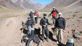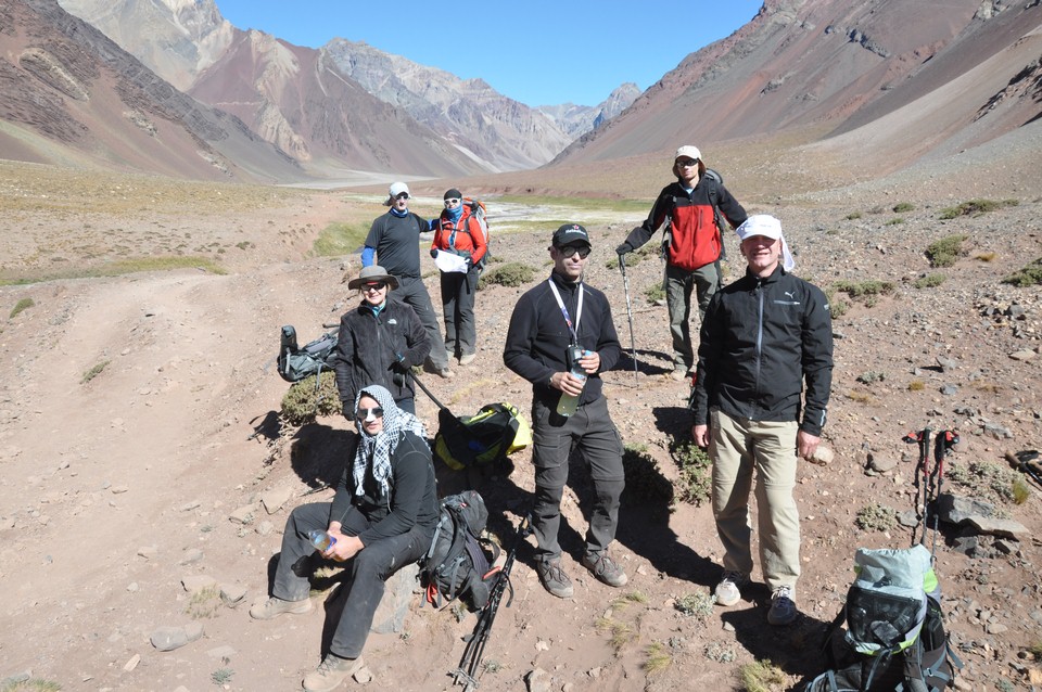 Kolejnego dnia już wszyscy razem szliśmy wolnym krokiem przez dolinę Horcones do bazy Plaza de Mulas, znajdującej się na wysokości 4300 m. Droga nie była trudna, ale męcząca, bo długa, a na końcu trekkingu trzeba było dość stromo podejść pod bazę. Czuliśmy się świetnie, wszyscy dobrze się aklimatyzowaliśmy; ja i moja koleżanka Edka miałyśmy idealną saturację – aż 94%. Następnego dnia mogliśmy iść w górę, ale rozsądek mówił, że skoro przewyższenie zrobiliśmy powyżej 1000 m, to powinniśmy odpocząć. A zatem następnego dnia mieliśmy leżećJ. Niestety nie ja, jak się okazało, bo mój naturalny izostar – miód rozpłynął się po moim worze transportowym. A tak szczelnie go schowałam, między puchami, a teraz miałam problem. Było już po godz. 18.00, słońce zaszło, a woda była zbyt lodowata, aby to posprzątać. Udało się tylko wyciągnąć z worka śpiwór. Następnego dnia musiałam zagrzać wiele litrów wody, bo po wypraniu w zimnej nadal wszystko się kleiło. Cały dzień więc prałam i suszyłam, ale nie ma co narzekać – na szczęście pogoda dopisała i w miarę doprowadziłam się do porządku… tyle że ze stratą sił… ale teraz to już tylko śmiech pozostaje.