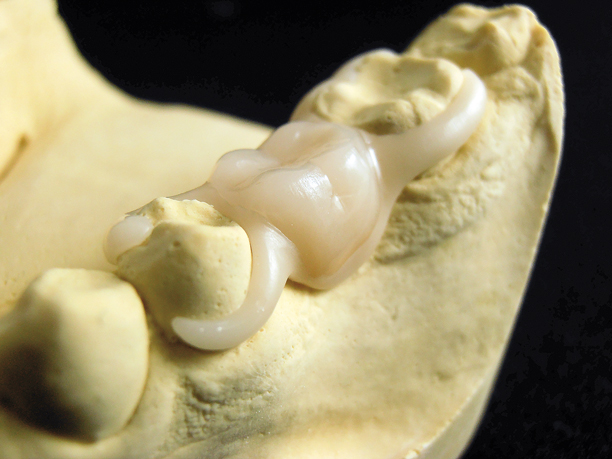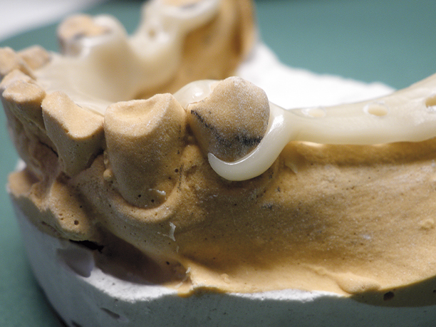 Ryc. 6. Utrzymywacz przestrzeni osadzony na modelu za pomocą klamer z żywicy acetalowej.