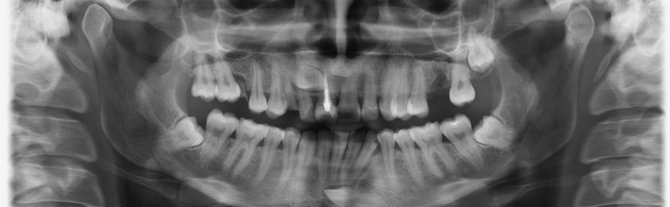 Zdjęcie pantomograficzne przedstawia brak korzenia podniebiennego w zębie trzonowym szczęki po stronie lewej