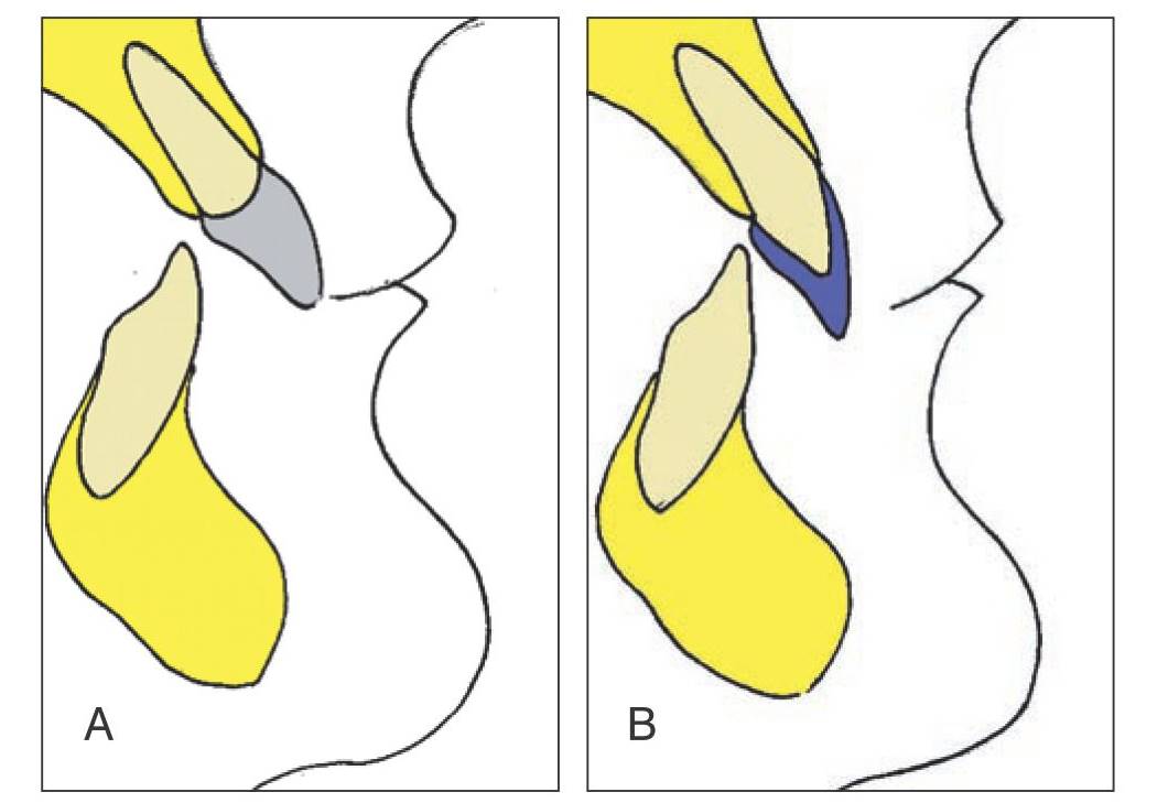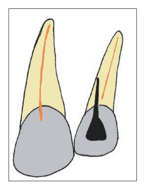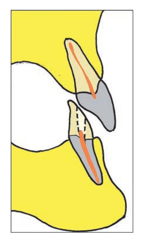Ryc. 9. Podczas stwarzania dostępu w zębach siecznych bocznych szczęki należy uwględnić dopodniebienne/dystalne pochylenie korzenia w stosunku do korony zęba, gdyż w przypadku obliteracji komory miazgi może dojść do perforacji ściany zęba w obrębie powierzchni bliższej korony/korzenia.
