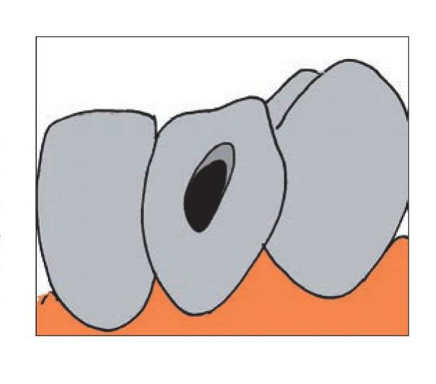 Ryc. 2. Zarys dostępu w kle dolnym stworzony w obrębie powierzchni wargowej (w związku ze ścisłym przyleganiem powierzchni językowej korony tego zęba do powierzchni bliższej pierwszego zęba przedtrzonowego, uniemożliwiającym stworzenie dostępu w sposób konwencjonalny).