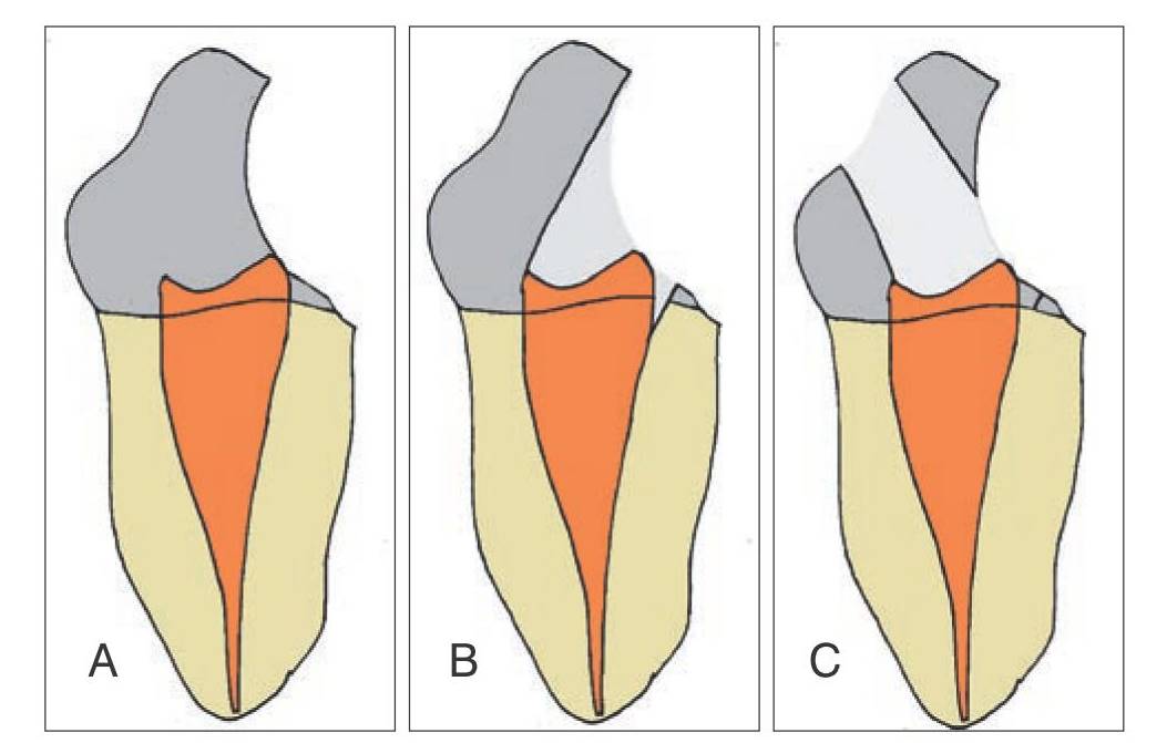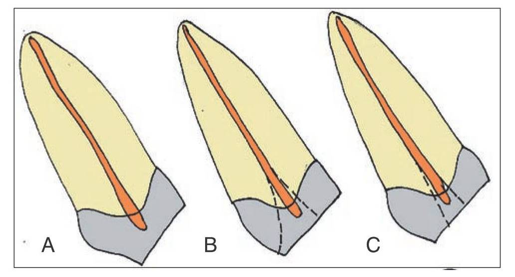 Ryc. 6. Zarys dostępu w zębie siecznym ze złamaną koroną zęba. A. Stan po złamaniu korony. B. Stwarzanie dostępu od strony językowej nie zapewniło prostolinijnego dojścia do systemu kanałowego i ostatecznie wymagało „przejścia” na powierzchnię sieczną, niepotrzebnie skutkując usunięciem zdrowych tkanek w obrębie powierzchni językowej. C. Zarys dostępu w obrębie powierzchni siecznej zapewniający prostolinijne dojście do systemu kanałowego bez niepotrzebnej utraty tkanek korony zęba.