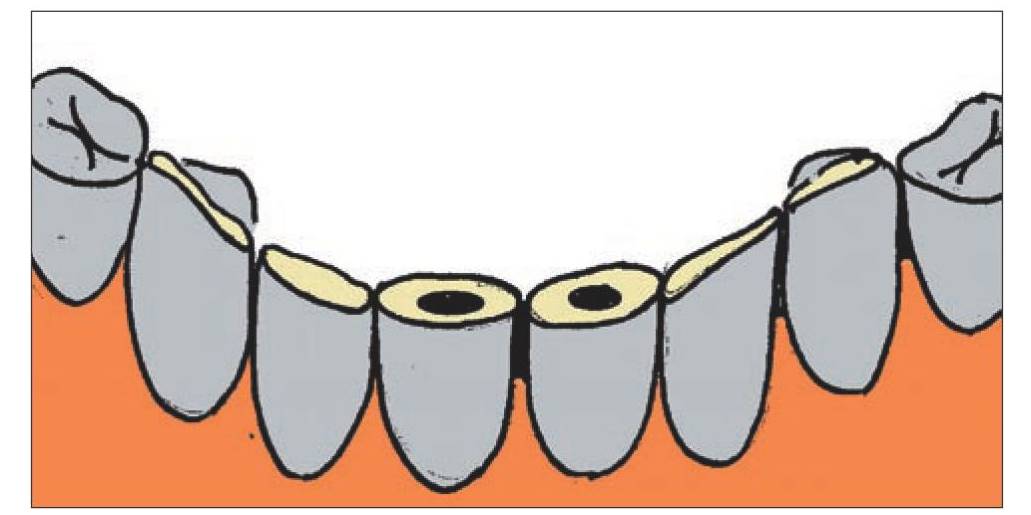 Ryc. 1. W przypadku zębów siecznych żuchwy ze znaczną retruzją dopuszcza się stworzenie zarysu dostępu w obrębie powierzchni wargowej.