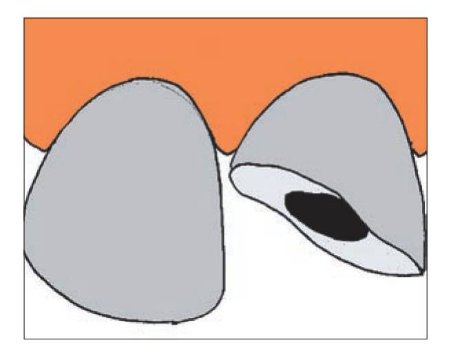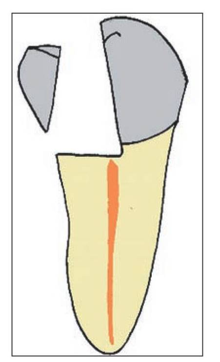 Ryc. 5. Zarys dostępu do jamy zęba stworzony w obrębie powierzchni siecznej powstałej w wyniku złamania korony zęba siecznego szczęki.
