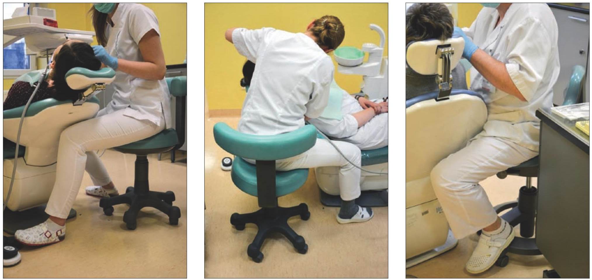 Ryc. 1, 2, 3. Typowe pozycje przyjmowane w czasie pracy lekarza dentysty.