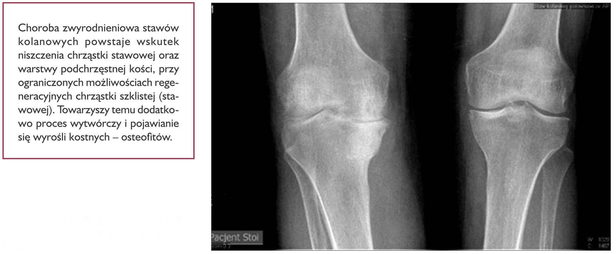 Choroba zwyrodnieniowa stawów kolanowych, zwana także gonartrozą (gonarthrosis), jest obecnie najczęstszą przyczyną niepełnosprawności na świecie (ryc. 4). Wiąże się to ze skomplikowaną budową i mechaniką stawów. Ulegają one przeciążeniom i szybszemu zużywaniu się w przypadku zaburzeń statyki ciała. Gonartroza ma charakter postępujący i obejmuje wszystkie elementy tworzące staw kolanowy, tzn. chrząstkę stawową, warstwę podchrzęstną, błonę maziową, torebkę stawową i więzadła stawowe. Na powstawanie zmian zwyrodnieniowych stawów dodatkowo wpływają takie czynniki, jak wiek, płeć żeńska (zgodnie z danymi Naczelnej Izby Lekarskiej z 4 stycznia 2018 r. w Polsce zawód lekarza dentysty wykonuje 27 671 kobiet i 8978 mężczyzn), siedzący tryb życia, nadwaga, przebyte w przeszłości urazy stawu, zaburzenia hormonalne, a także toczące się przewlekłe procesy zapalne, np. reumatoidalne zapalenie stawów.