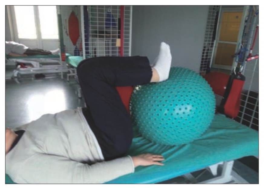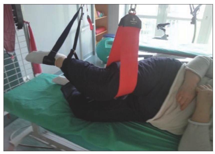 Ryc. 5, 6. Ćwiczenia fizjoterapeutyczne: czynne wspomagane i czynne w odciążeniu.