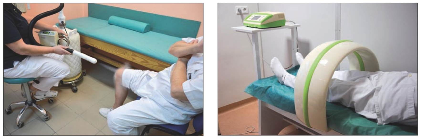 Ryc. 7, 8. Zabiegi: krioterapii miejscowej oraz pola magnetycznego niskiej częstotliwości.