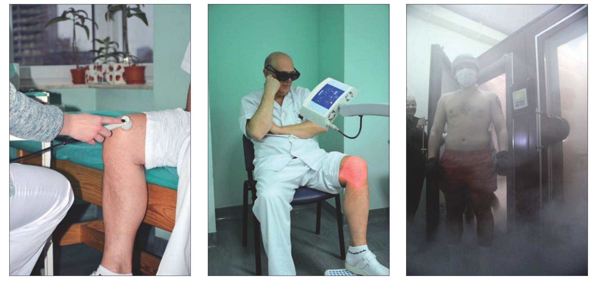 Ryc. 9, 10, 11. Zabiegi fizykoterapii: ultradźwięków, biostymulacji laserowej, krioterapii ogólnoustrojowej.