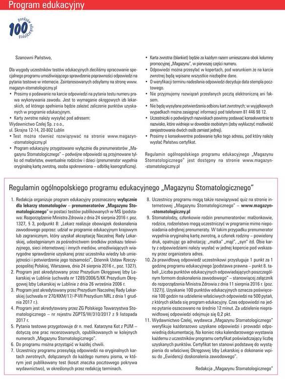 1. Redakcja organizuje program edukacyjny przeznaczony wyłącznie dla lekarzy stomatologów – prenumeratorów „Magazynu Stomatologicznego” w postaci testów publikowanych w MS. Program edukacyjny na rok lata 2023-2025 opracowano, działając na podstawie Rozporządzenie Ministra Zdrowia z dnia 21 lutego 2022 r. w sprawie sposobu dopełnienia obowiązku doskonalenia zawodowego lekarzy i lekarzy dentystów poz. 464, § 1, podpunkt 8: „Doskonalenie zawodowe lekarza i lekarza dentysty jest realizowane przez: udział w programie edukacyjnym udostępnianym za pośrednictwem środków przekazu telewizyjnego, sieci internetowej lub innych mediów, które umożliwiają wiarygodne sprawdzenie uzyskanej przez uczestnika wiedzy lub umiejętności i potwierdzenie jego tożsamości: a) który uzyskał akceptację Naczelnej Rady Lekarskiej, b) zagranicznym, którego organizatorem jest uczelnia medyczna, lekarskie towarzystwo naukowe, międzynarodowa organizacja lekarska lub podmiot, którego działalność w zakresie kształcenia podyplomowego lekarzy lub lekarzy dentystów uzyskała akredytację właściwego organu w państwie, w którym działalność ta jest prowadzona.” (Dziennik Ustaw Rzeczypospolitej Polskiej, Warszawa, dnia 25 luty 2022 r., poz. 464).
