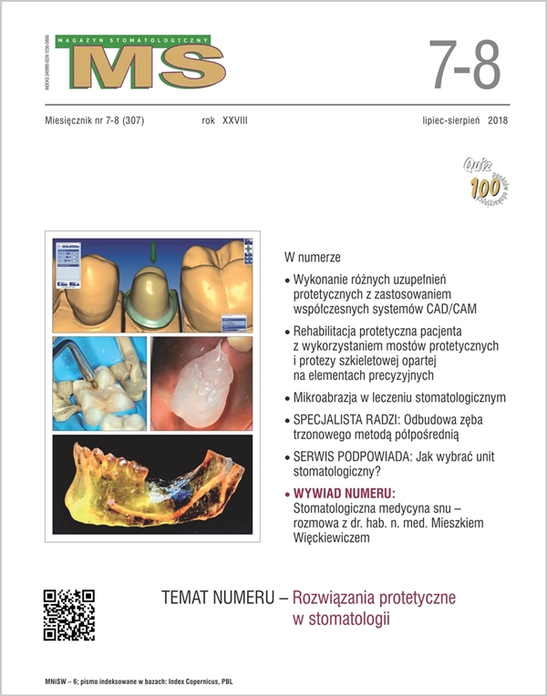 tematem miesiąca wakacyjnego numeru „Magazynu Stomatologicznego” jest szeroko rozumiana protetyka stomatologiczna. Zagadnienie to prezentują m.in. artykuły poświęcone systemom CAD/CAM. Opisano w nich materiały stosowane do wykonywania uzupełnień w tych systemach, ukazano ich zalety i wady oraz kierunki dalszego rozwoju, przedstawiono także przykłady konkretnych zastosowań w praktyce klinicznej. W temacie miesiąca znajdą Państwo ponadto dwie ciekawe prace kazuistyczne – pierwsza z nich dotyczy rehabilitacji protetycznej pacjenta z wykorzystaniem mostów protetycznych i protezy szkieletowej opartej na elementach precyzyjnych, druga zaś przedstawia leczenie protetyczne pacjenta po okaleczającym zabiegu chirurgicznym z powodu nowotworu jamy ustnej.