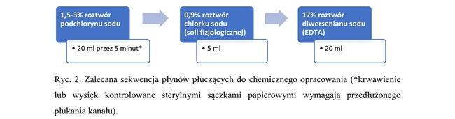 - 1,5-3% roztwór podchlorynu sodu – 20 ml przez 5 minut (krwawienie lub wysięk kontrolowane sterylnymi sączkami papierowymi wymagają przedłużonego płukania kanału),