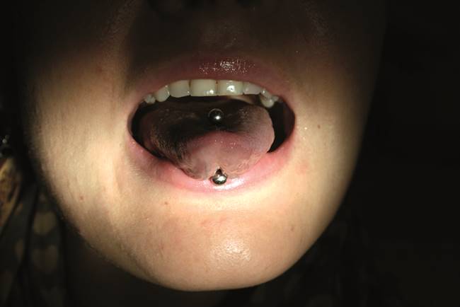 Rycina 4 – Zdziemborska A., Skoczylas M., Deszczyńska K., Jodkowska E.: Kolczykowanie jamy ustnej – forma zdobienia czy zagrożenie zdrowotne? Mag. Stomatol., 2012, 22, 3, 107.