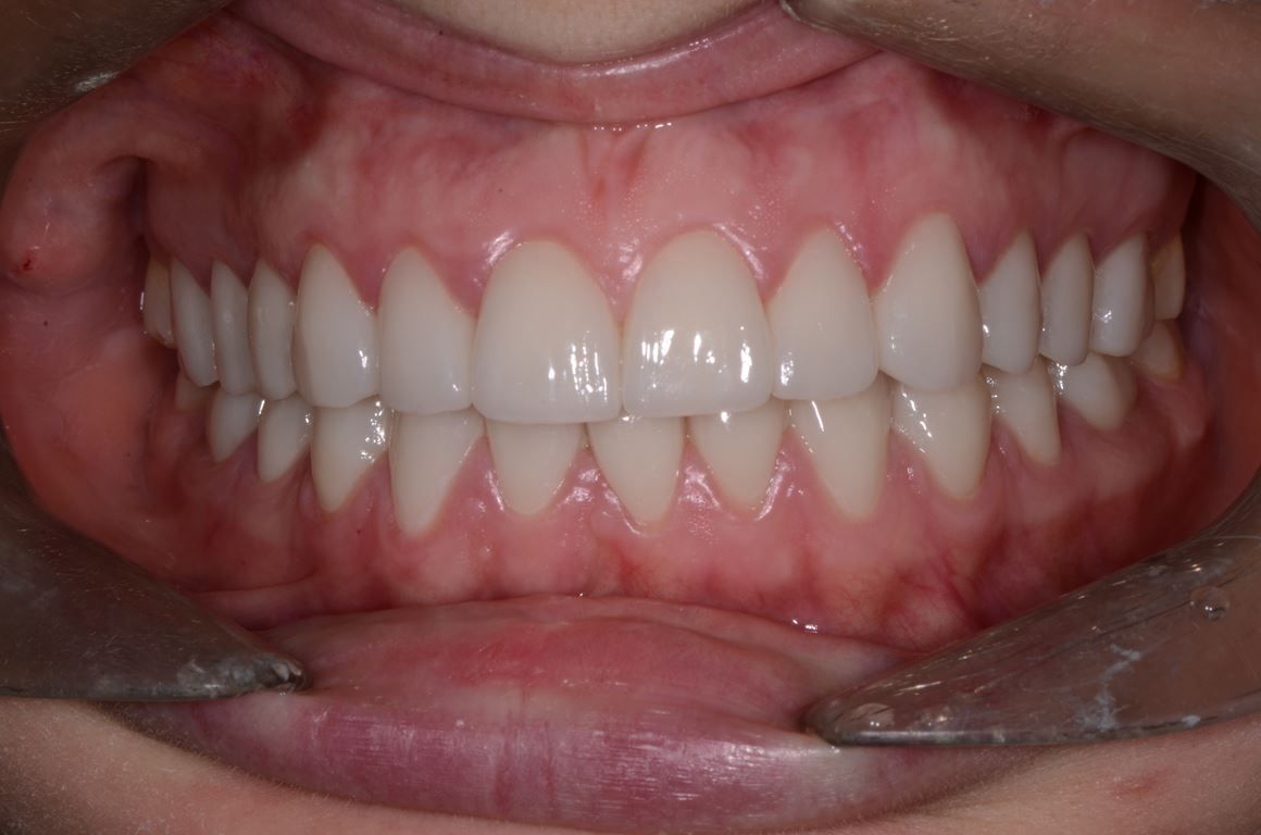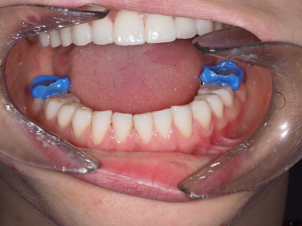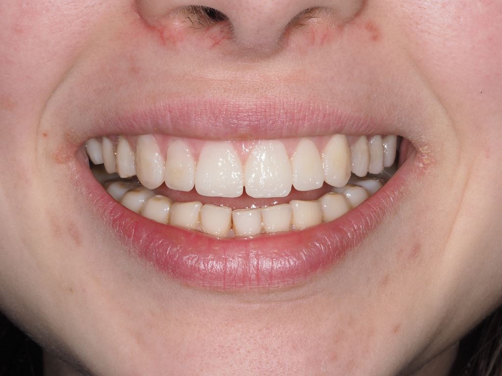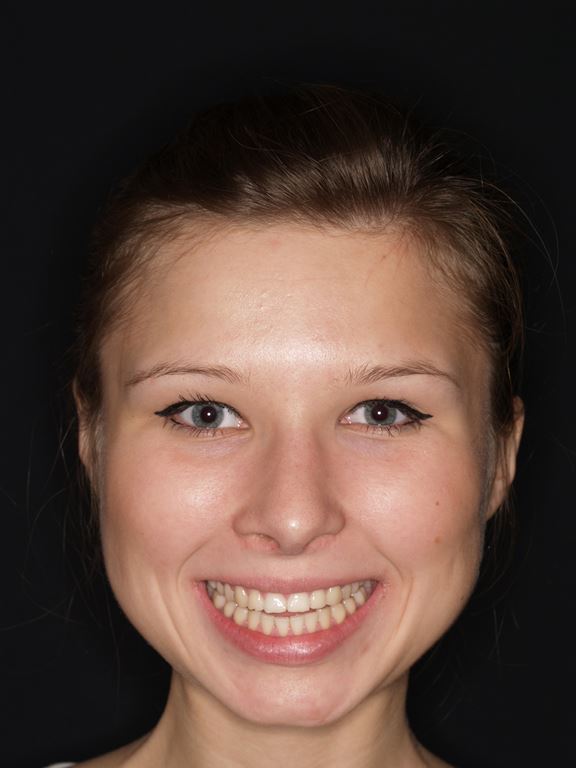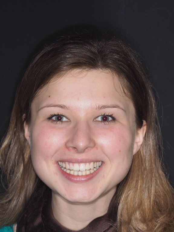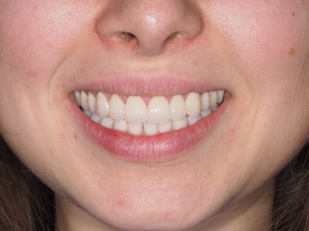 Pacjentka 21-letnia zgłosiła się do gabinetu, zaniepokojona znacznym starciem zębów. W wywiadzie podała nocne zgrzytanie zębami. Niedawno zakończyła leczenie ortodontyczne, którego celem, zgodnie z uzyskanymi od niej informacjami, miało być rozwiązanie problemu nadmiernie ścierających się zębów – nie przyniosło ono jednak spodziewanych rezultatów. Obecnie pacjentka oczekiwała przede wszystkim poprawy estetyki uśmiechu przez wydłużenie zębów przednich i zabezpieczenie ich przed pojawiającymi się odpryskami szkliwa oraz rozwiązania problemu uogólnionej nadwrażliwości.