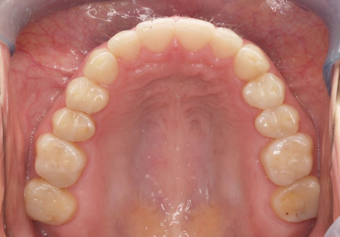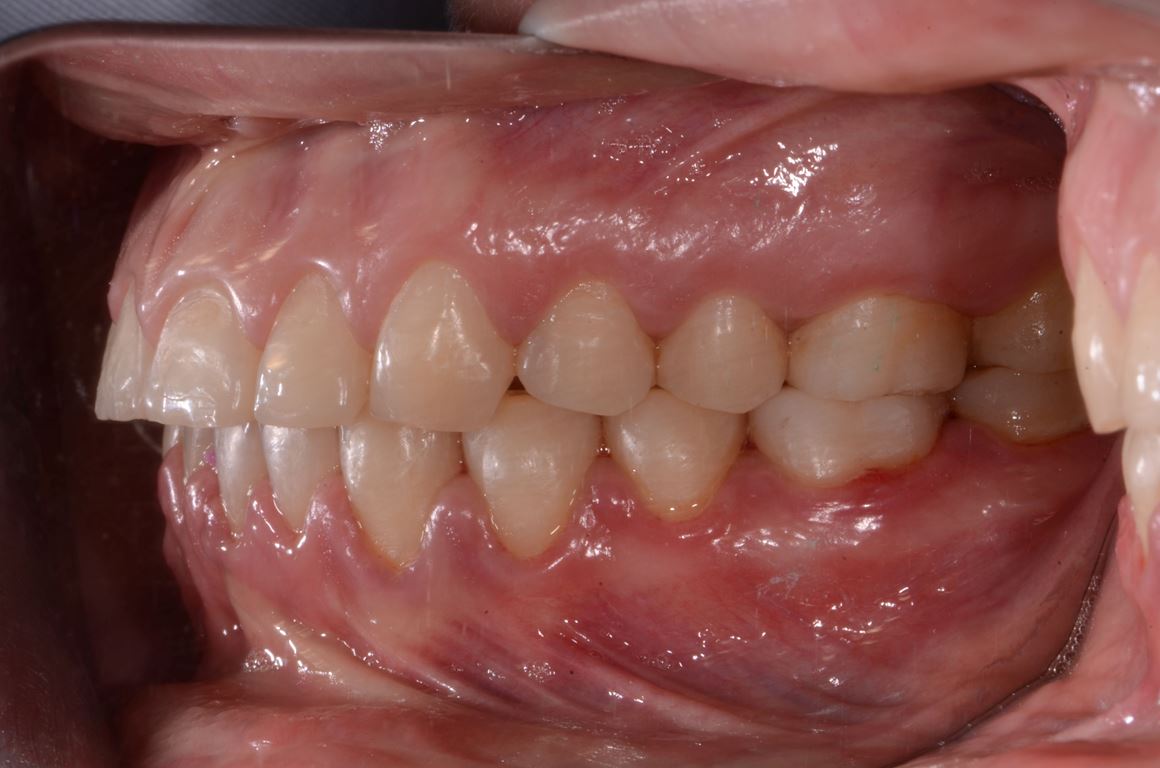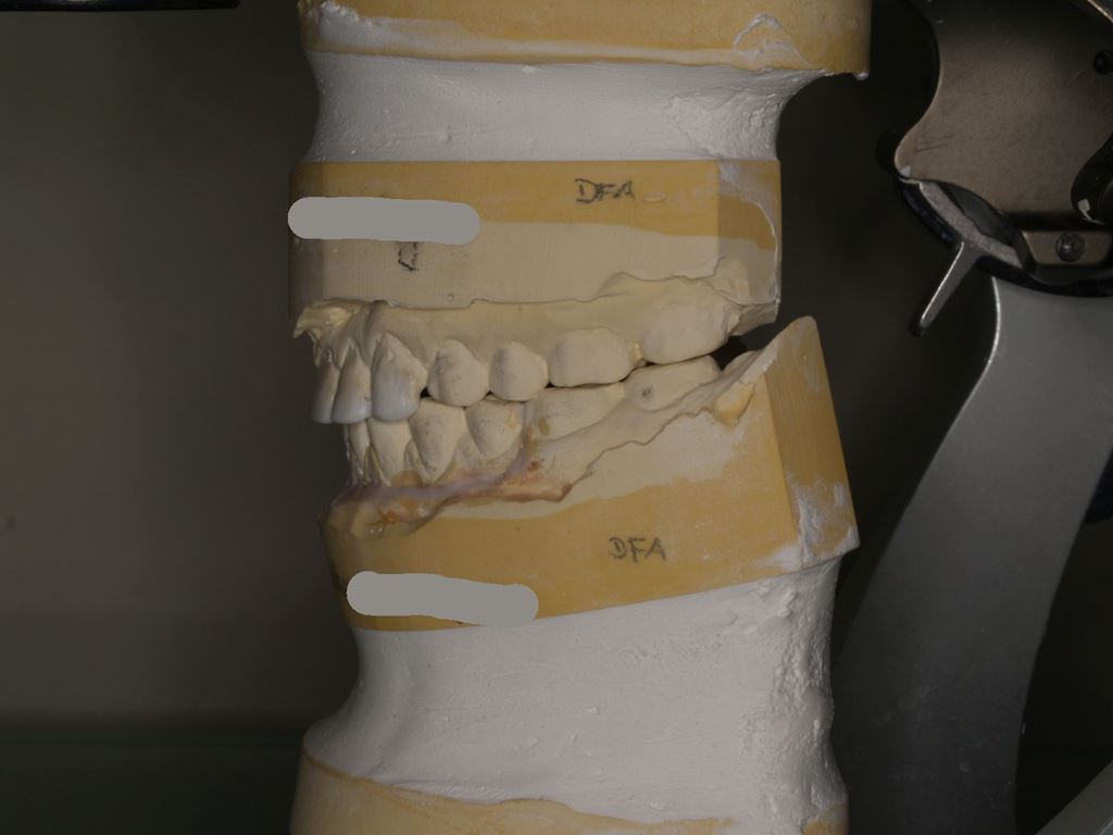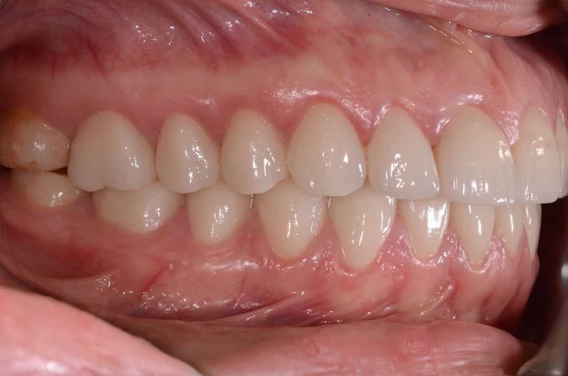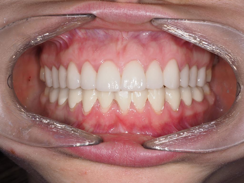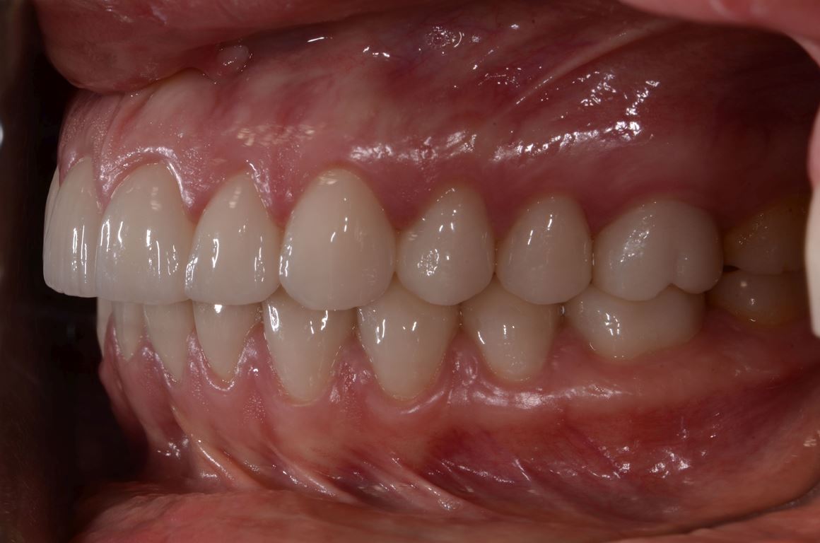 Drugie zęby trzonowe nie zostały włączone w rekonstrukcję pomimo znacznej utraty wysokości koron. Dzięki temu podniesienie wysokości zwarcia mogło być zminimalizowane oraz uniknięto konieczności preparacji zniszczonych powierzchni zwarciowych tych zębów. Po przebudowie warunków zwarciowych na pozostałych zębach uzyskano prowadzenie przednie i kłowe, co potencjalnie dało ochronę zębów trzonowych przed destrukcyjnymi siłami bocznymi.