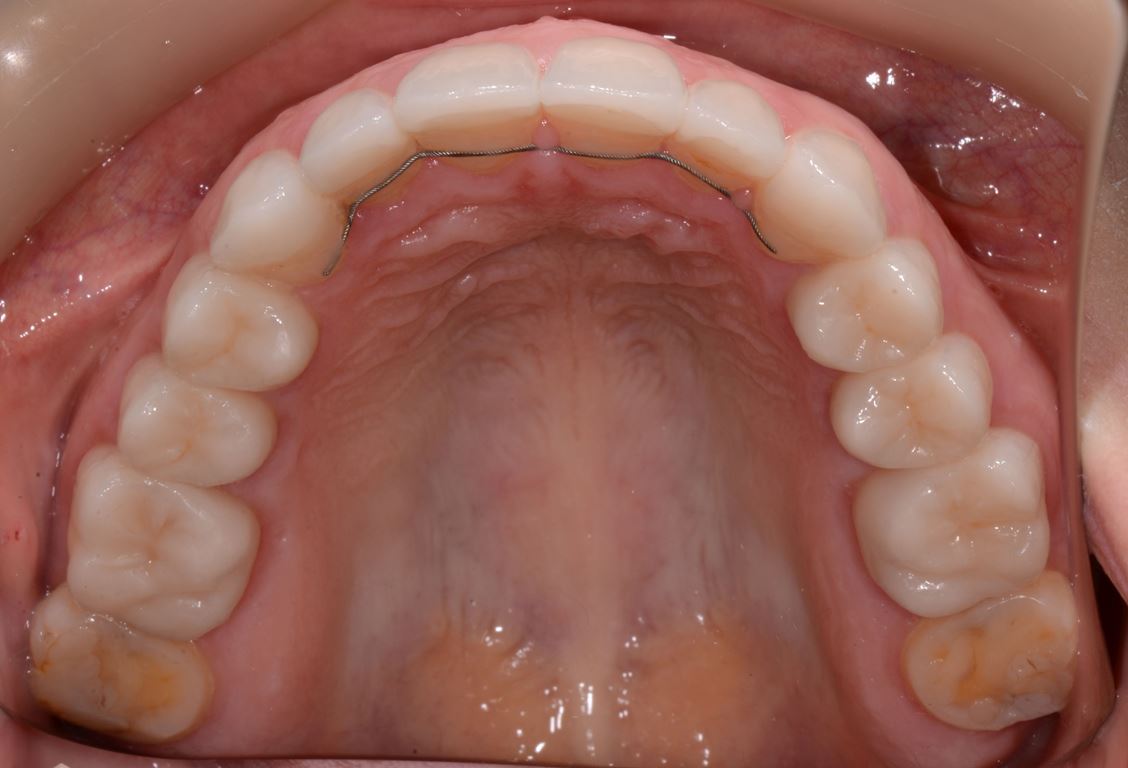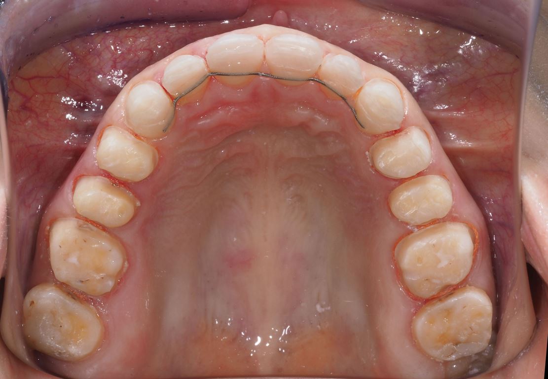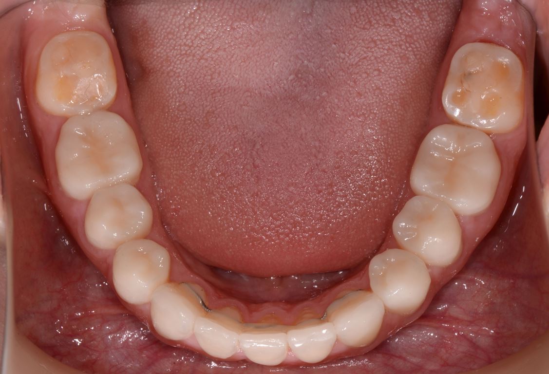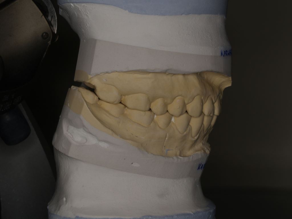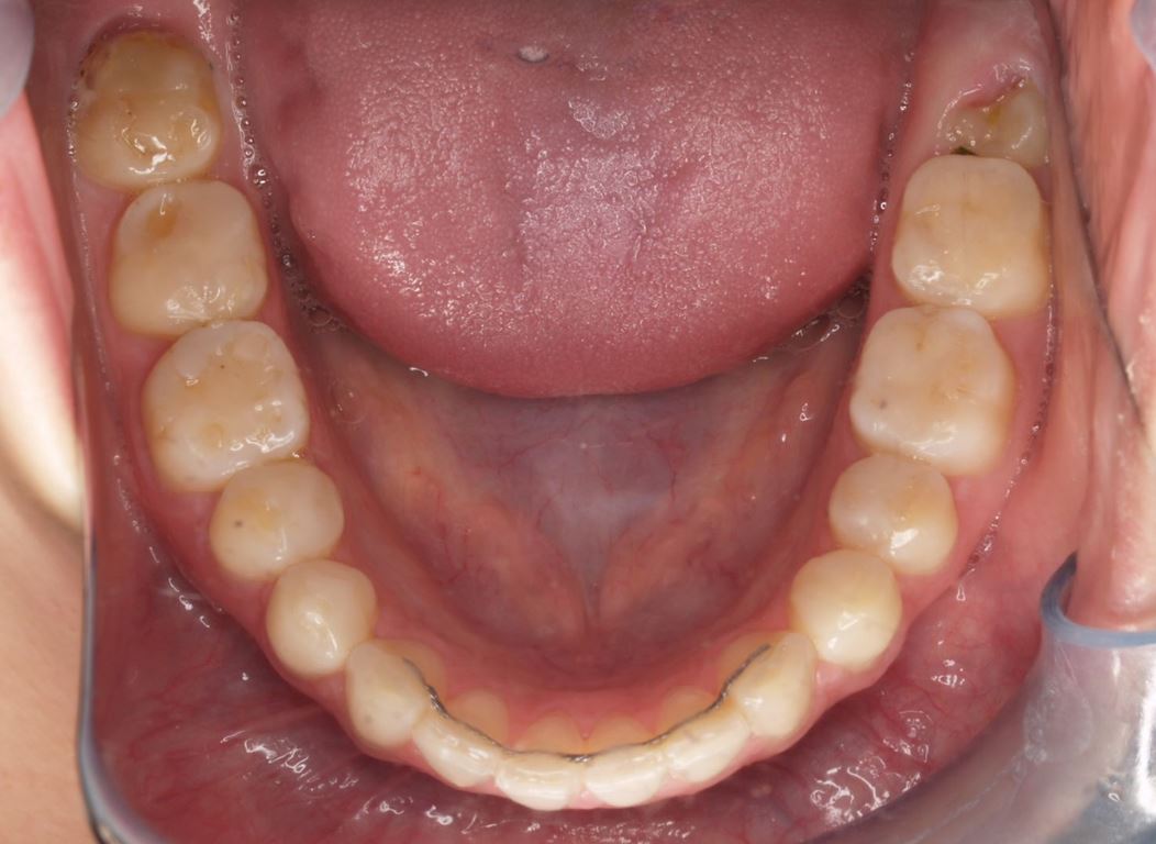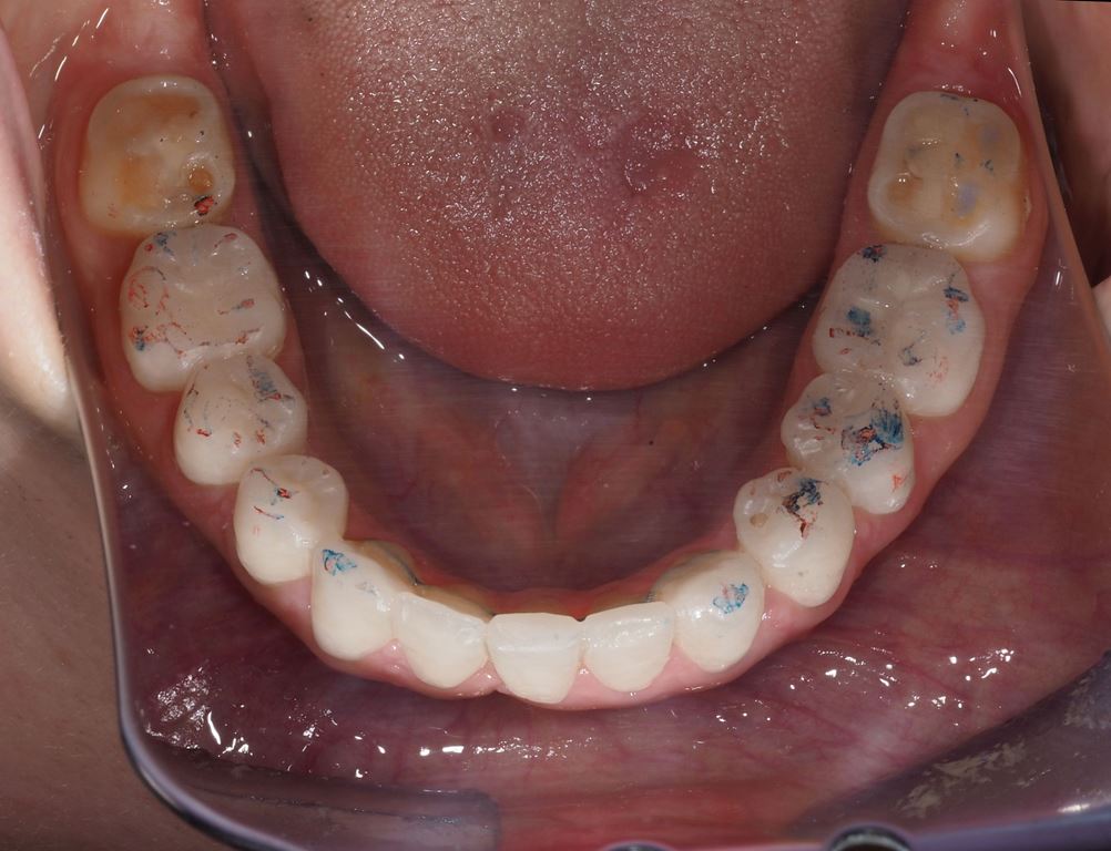 Uzyskanie prawidłowych relacji pomiędzy zębami przednimi górnego i dolnego łuku zębowego wymagało zwężenia dolnego łuku i cofnięcia zębów przednich w kierunku dojęzykowym. Zwężenie poprzez wykonanie strippingu nie byłoby wystarczające, dlatego zaplanowano usunięcie jednego z dolnych zębów siecznych przyśrodkowych. Osiągnięta w ten sposób zmiana relacji zębów umożliwiała odtworzenie warunków zwarciowych zgodnie z koncepcją okluzji wielostronnie chronionej (ang. mutually protected occlusion).