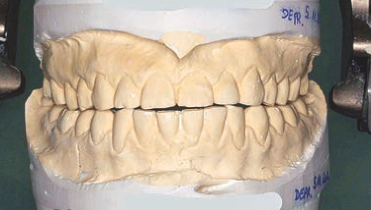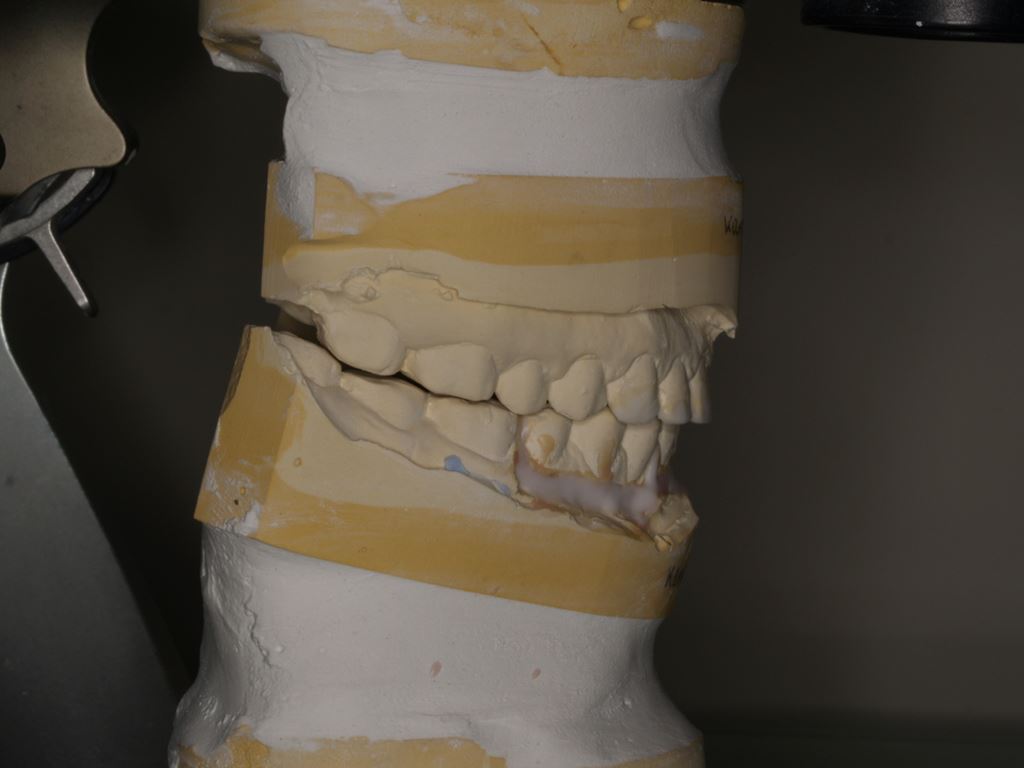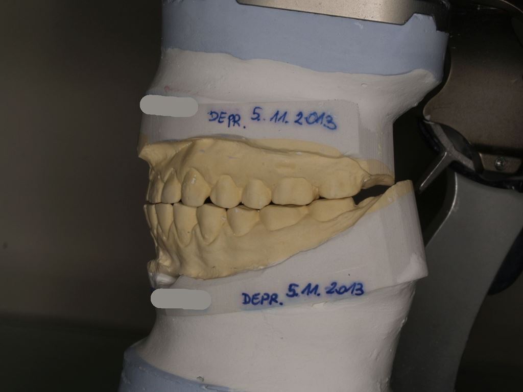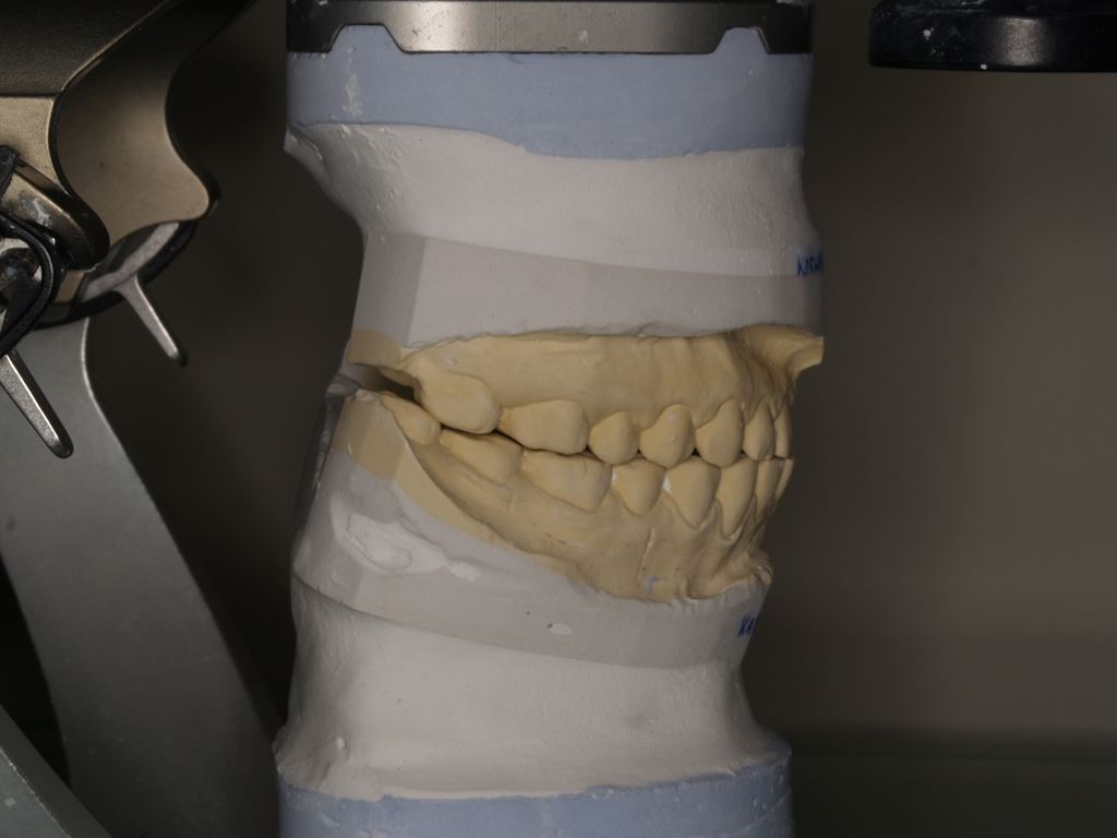 Wykonano także modele diagnostyczne zaartykulowane w relacji centralnej (RC), którą zarejestrowano ze względu na zwiększone napięcie mięśniowe z wykorzystaniem deprogramatora Koisa (ryc. 13-15), oraz zdjęcie pantomograficzne (ryc. 16) i cefalometryczne. Analiza modeli w RC wykazała przesunięcie żuchwy w kierunku doprzednim w stosunku do pozycji maksymalnego zaguzkowania i przedwczesne kontakty funkcjonalne na zębach bocznych, co tłumaczyło obecność odprysków szkliwa na brzegach siecznych górnych zębów (szczególnie wyraźne na zębie 12) (ryc. 14, 17). Na modelach wykonano studium funkcjonalne mające na celu określenie, w jaki sposób można odtworzyć prawidłową funkcję, tzn. uzyskać prawidłowy nagryz pionowy i poziomy oraz prowadzenie przednie (ryc. 18-20).