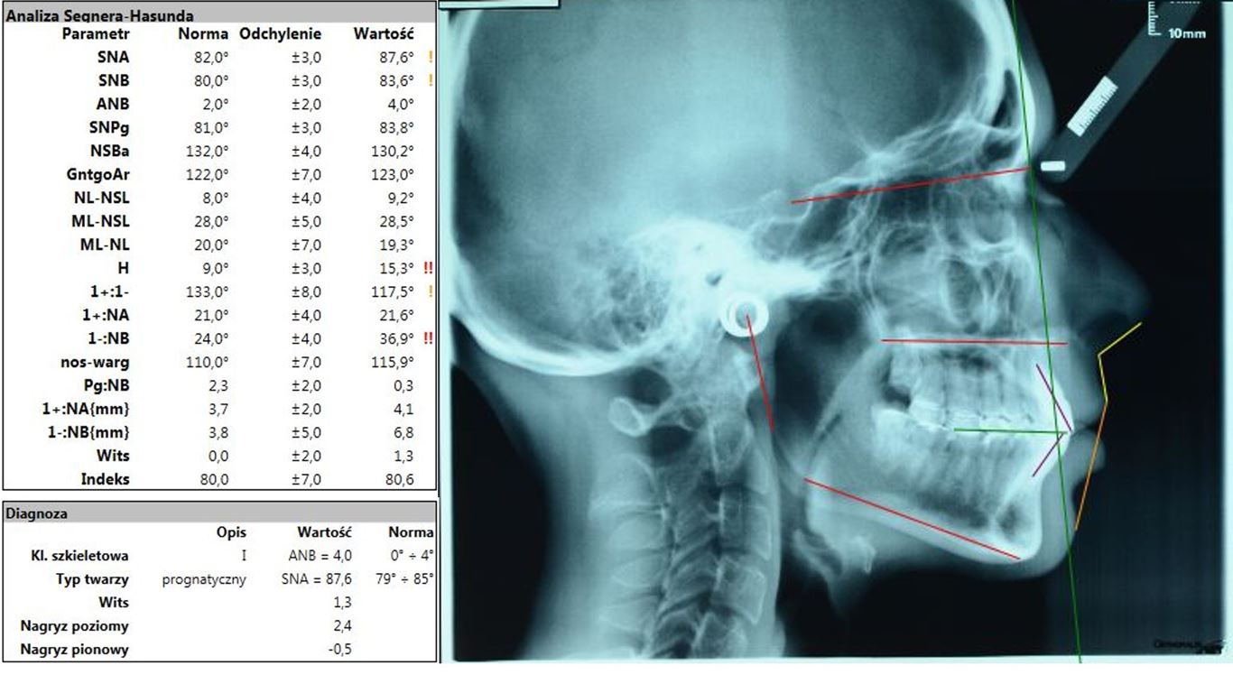 Minimalne zachodzenie pionowe, a w pozycji RC ustawienie zębów przednich w zgryzie tête à tête nasuwały podejrzenie wady gnatycznej. Analiza zdjęcia cefalometrycznego wykazała wprawdzie prognatyczny typ twarzy, jednak I klasę szkieletową, rotację i translację żuchwy w normie oraz neutralną relację sagitalną i wertykalną podstaw (ryc. 21). Pozwoliło to zaplanować poprawę relacji pomiędzy górnym i dolnym łukiem zębowym przez leczenie ortodontyczne poprzedzone ekstrakcją jednego dolnego zęba siecznego oraz dolnych zębów ósmych. Po leczeniu ortodontycznym zaplanowano chirurgiczne wydłużenie koron przednich zębów górnych i wykonanie adhezyjnych rekonstrukcji ceramicznych na wszystkich zębach szczęki i żuchwy z wyłączeniem drugich zębów trzonowych.