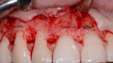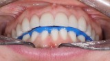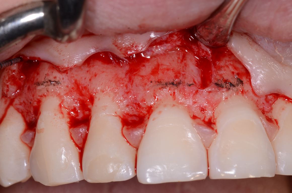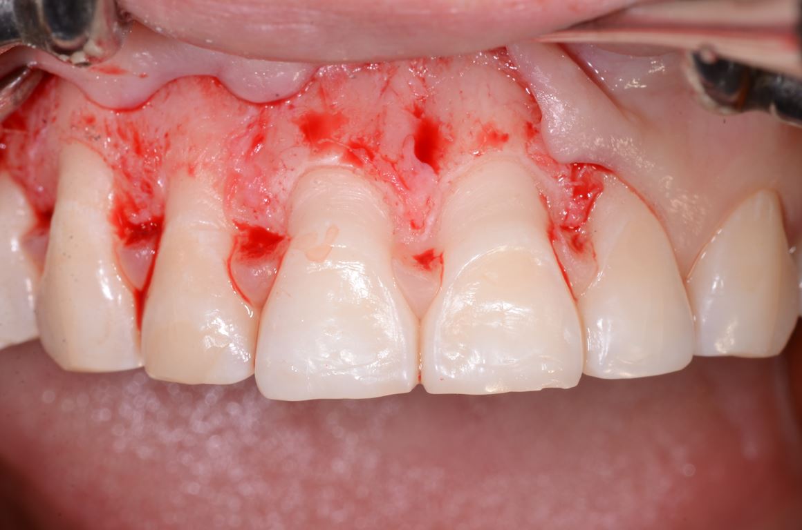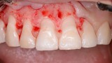 Analiza fotografii z mock-upem potwierdziła konieczność wydłużenia koron klinicznych wszystkich zębów przednich o około 2 mm w kierunku dokoronowym oraz zębów 13-21 w kierunku dowierzchołkowym, w celu zharmonizowania poziomu zenitów dziąsłowych. W związku z tym w okolicy zębów 13-21 wykonano zabieg chirurgicznego wydłużania koron (ryc. 28, 29).