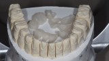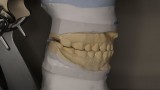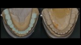 Następny etap leczenia polegał na adhezyjnym osadzeniu rekonstrukcji wykonanych z materiału E-max (Ivoclar, Liechtenstein). Po cementowaniu przystąpiono do preparacji zębów dolnego łuku zębowego. Pozostawienie wszystkich drugich zębów trzonowych w pierwotnym kształcie umożliwiło łatwą rejestrację pozycji żuchwy w RC przed rozpoczęciem preparacji, którą wykonano na twardym materiale (LuxaBite, DMG, Niemcy) (ryc. 32, 33). Po zakończeniu preparacji rejestrat zwarciowy powiększono o odcinek przedni, wykonano wyciski oraz zabezpieczono filary wcześniej przygotowanymi i podścielonymi uzupełnieniami z PMMA (ryc. 34-36). Podobnie jak w łuku górnym, w następnym etapie sprawdzono wewnątrzustnie prototyp rekonstrukcji wyfrezowany w PMMA, na którym wykonano niezbędne korekty zwarcia (ryc. 37, 38). Ostatni etap leczenia polegał na adhezyjnym cementowaniu rekonstrukcji dolnego łuku zębowego.