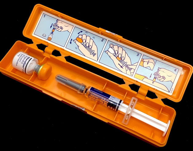 W lekkiej hipoglikemii należy podać 10-20 g glukozy. Natomiast w hipoglikemii ciężkiej, gdy objawy są na tyle nasilone, że uniemożliwiają doustne podanie glukozy, należy ją podać dożylnie (najlepiej 20% roztwór glukozy, a następnie wlew 10% roztworu glukozy). Jeżeli dostęp dożylny jest utrudniony, można zastosować 1 mg glukagonu, podając go podskórnie lub domięśniowo. Optymalnym rozwiązaniem są gotowe zestawy zawierające jednorazową dawkę biosyntetycznego ludzkiego glukagonu i strzykawkę z roztworem do rozpuszczenia (ryc. 5) (11-13).