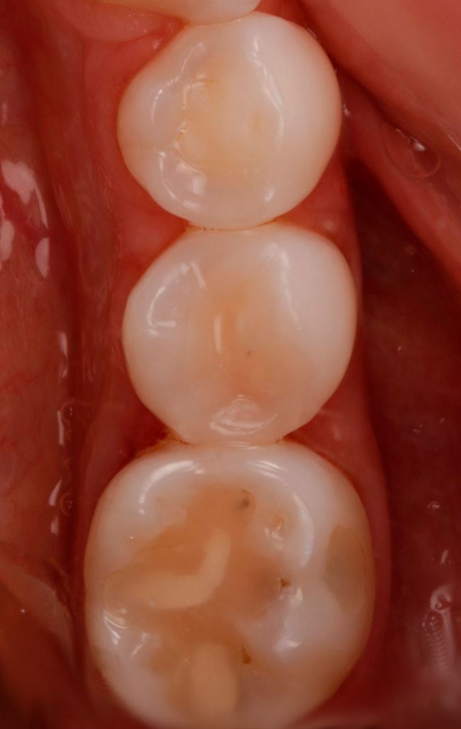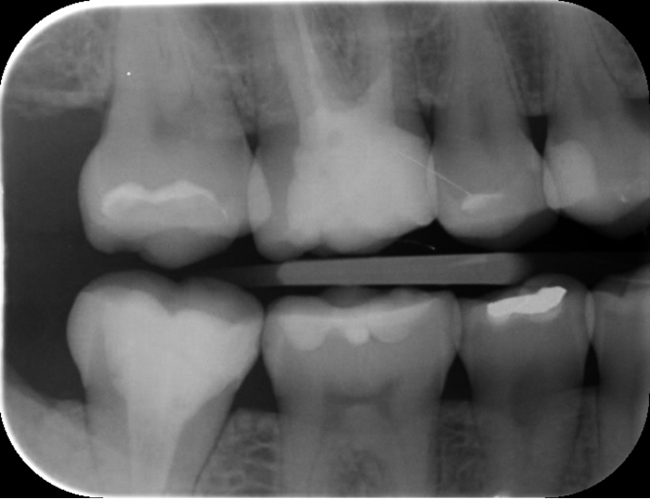 Można się zastanawiać, czy w zębie 45 dystalnie demineralizacja dotarła już do zębiny. Nie ma co liczyć, że ognisko próchnicy ulegnie remineralizacji, nawet jeśli pacjentka zacznie sumiennie oczyszczać przestrzenie międzyzębowe. Wyjście jest jedno: trzeba opracować ubytek i wykonać wypełnienie. Tylko czy można mieć pewność, że jest tam próchnica, którą należy usunąć? Czy na pewno ubytek przekroczył granicę szkliwno-zębinową?