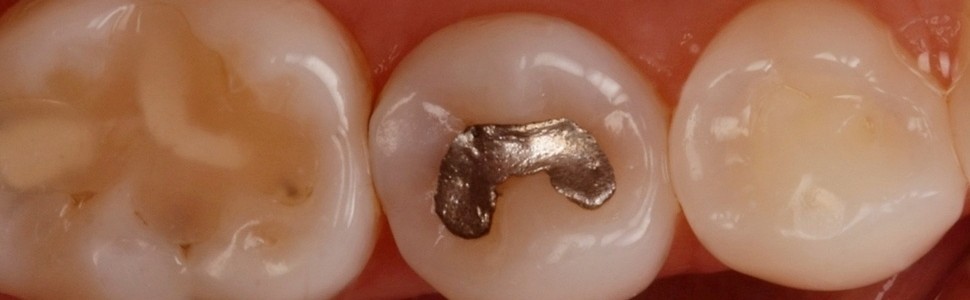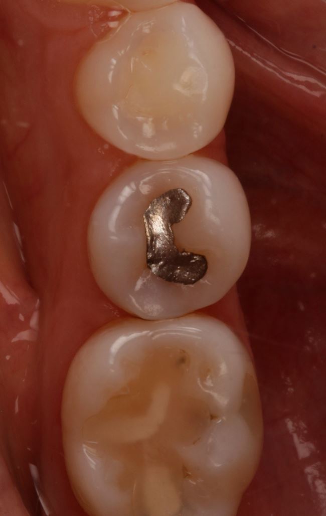 Ryc. 7. Ząb 45 przed usunięciem wypełnienia amalgamatowego.