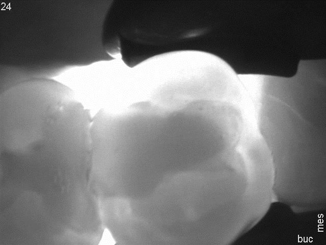 Ale już na powierzchni dystalnej, w obrębie szkliwa, w obrazie kamery można dostrzec ciemniejszy trójkąt. Na zdjęciu skrzydłowo-zgryzowym zresztą też… Obraz z kamery tylko potwierdził obserwacje dokonane na podstawie tego zdjęcia. Demineralizacja nie przekracza granicy szkliwno-zębinowej, pozostawiamy więc do obserwacji i udzielamy pacjentce odpowiednich instrukcji.