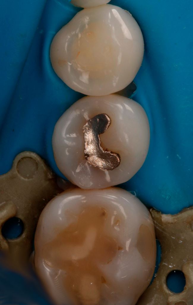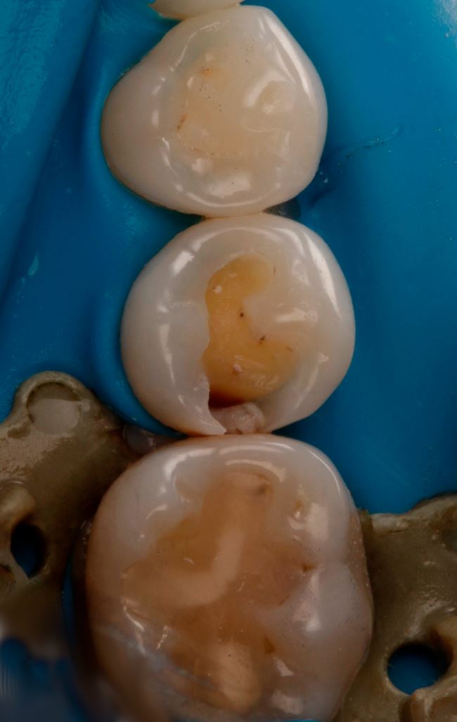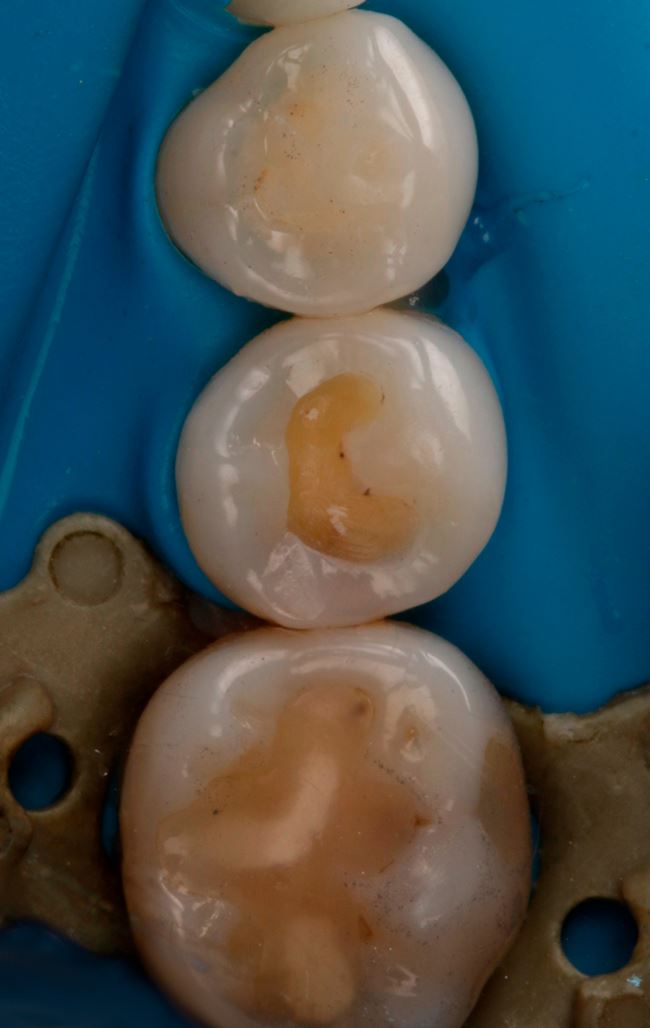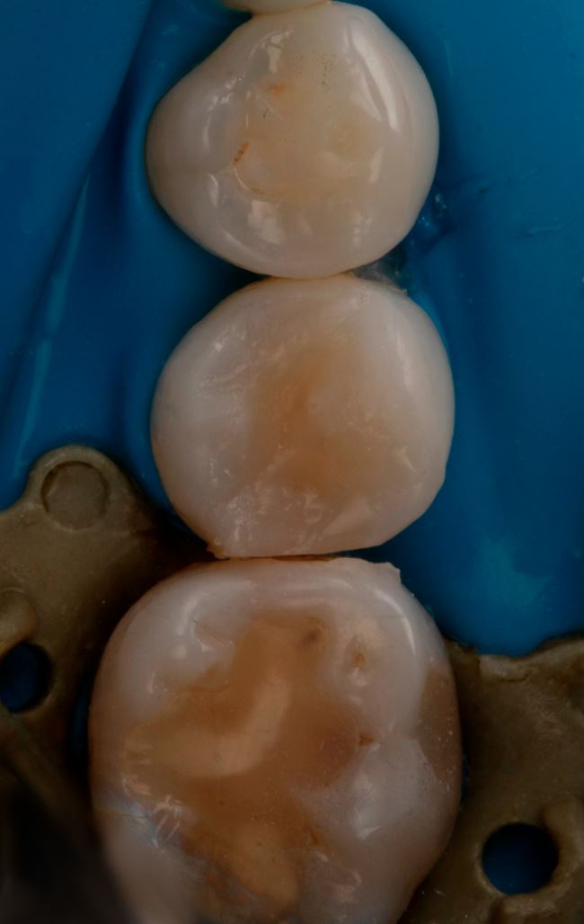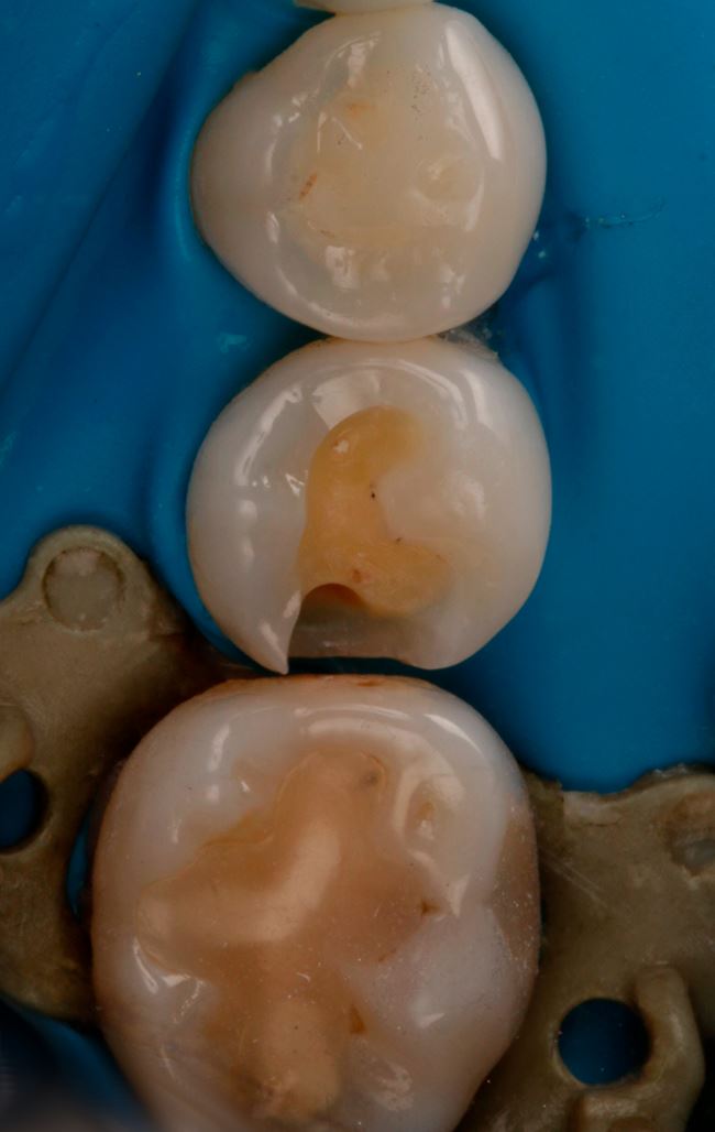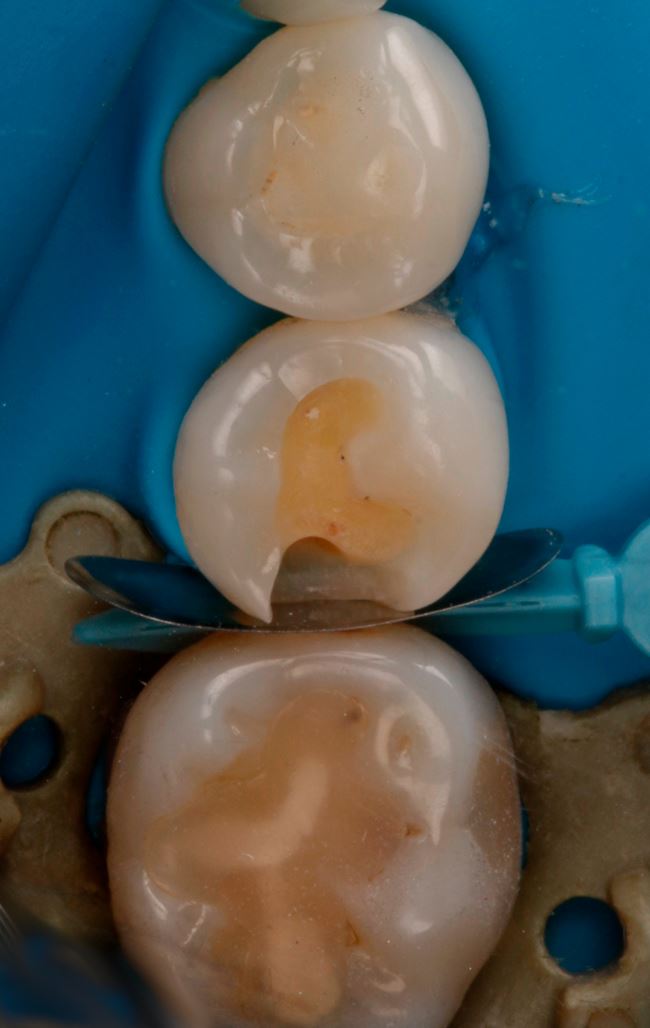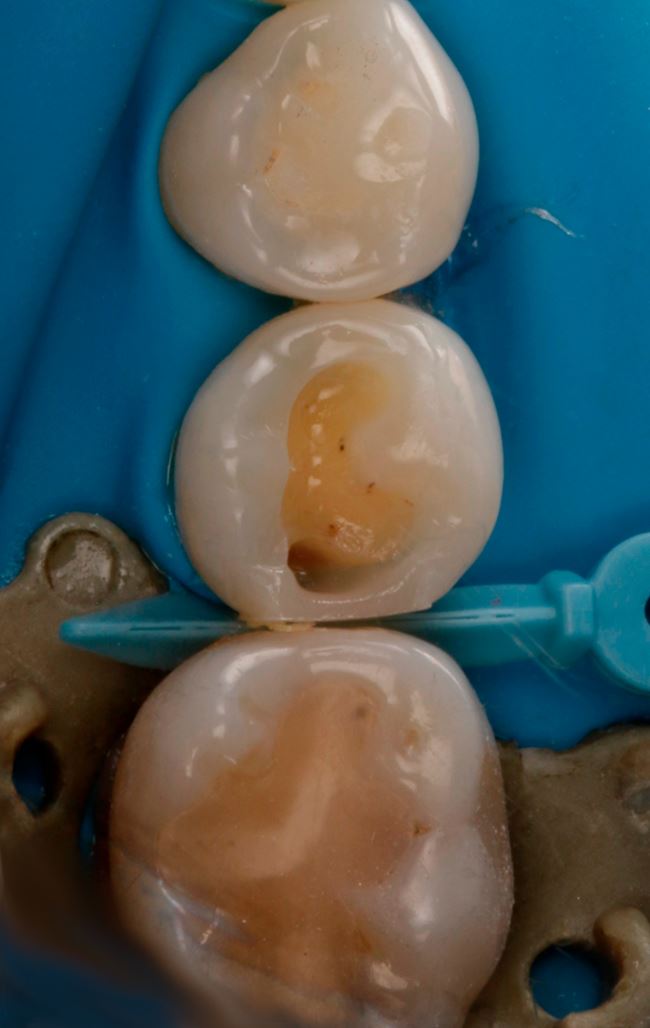 Ryc. 13. Odtworzenie ściany stycznej w zębie 45 nanohybrydowym materiałem kompozytowym Harmonize Enamel A3.