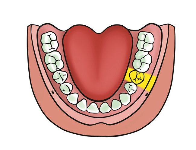 Ryc. 9. Podstawowy punkt wkłucia - ząb trzonowy 46: dystalnie.