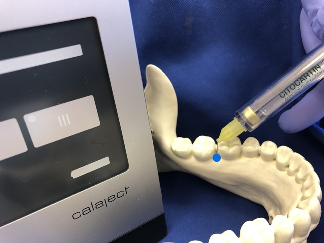 Wprowadzenie na rynek systemów do komputerowo kontrolowanych iniekcji umożliwia przeprowadzanie znieczuleń śródwięzadłowych bez manualnie generowanego nadmiernego ciśnienia i prędkości. Komputer utrzymuje stały powolny przepływ anestetyku (około 180 s dla ampułki 1,7 ml). Jest to 3-krotnie mniejsza prędkość niż rekomendowana maksymalna prędkość dla innych iniekcji i jest preferowaną prędkością dla takich tkanek typu 3 jak ozębna (9). Uzyskane w systemie Calaject niskie ciśnienie i wolny przepływ płynu dają możliwość uzyskania większej penetracji anestetyku i dzięki temu skutecznego znieczulenia. Dodatkowo niskie ciśnienie i niska prędkość podawania często powodują brak konieczności stosowania znieczulenia powierzchniowego. Zaletą stosowania znieczulenia śródwięzadłowego z wykorzystaniem systemu komputerowego Calaject jest m.in. kontrolowana prędkość i ciśnienie deponowania płynu, użycie małej dawki środka znieczulającego, wyłączenie ośrodków bólowych w pojedynczych zębach, zapobieganie rozprzestrzeniania się znieczulenia na sąsiednie zęby oraz okoliczne tkanki, jak to ma miejsce w efekcie znieczulenia nasiękowego lub przewodowego wykonanych metodami konwencjonalnymi (10).