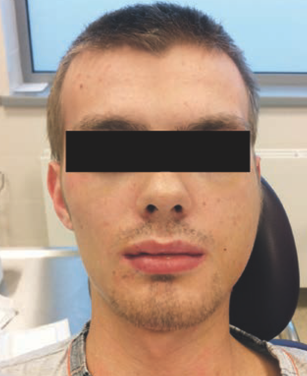 Mężczyzna 20-letni został przyjęty na Oddział Chirurgii Szczękowo-Twarzowej Uniwersyteckiego Centrum Klinicznego z powodu narastającego obrzęku i asymetrii twarzy w okolicy przedusznej lewej (ryc. 1).