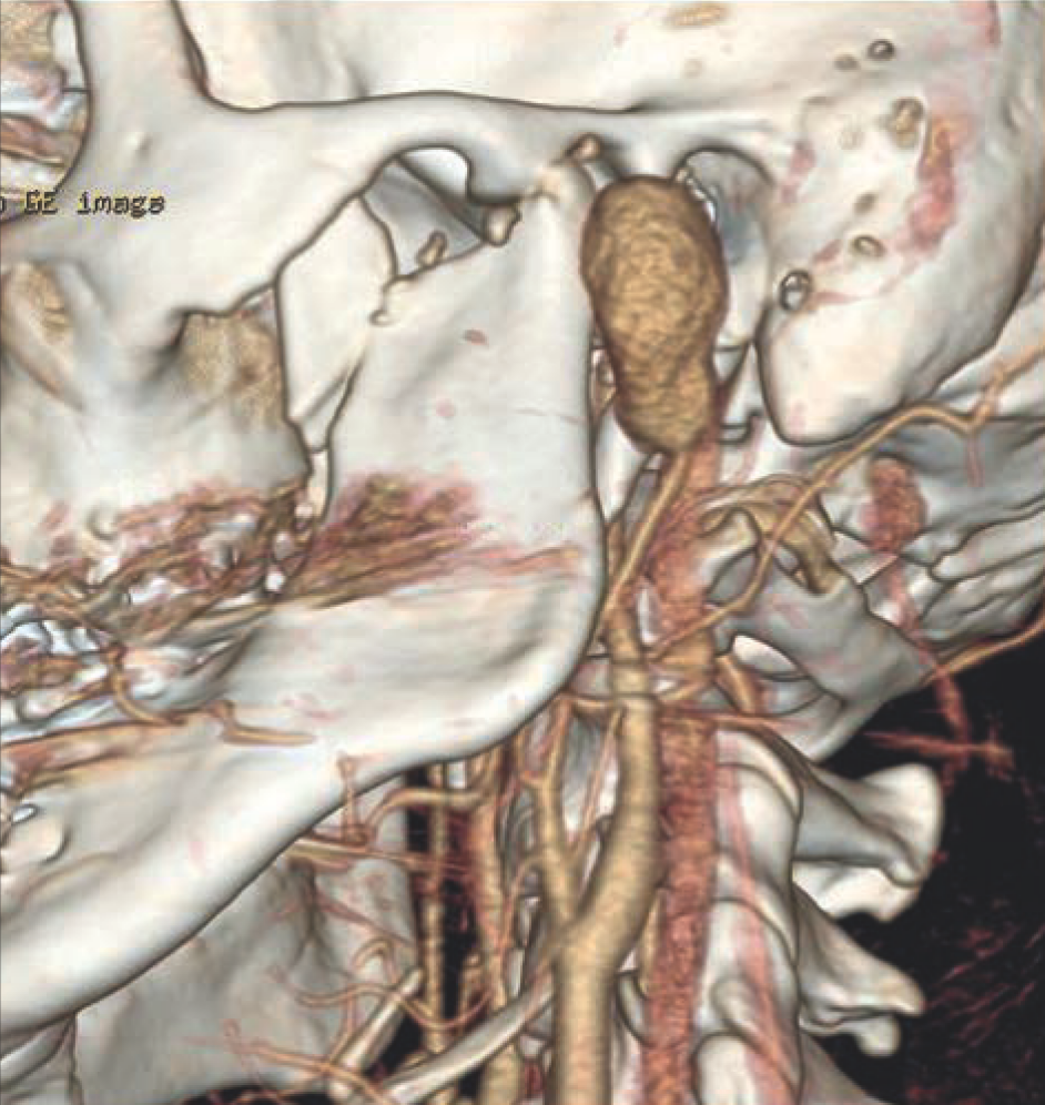 Pourazowy tętniak rzekomy tętnicy szyjnej zewnętrznej i jej odgałęzień występuje niezwykle rzadko (1, 2). Do tej pory opisano tylko 35 takich przypadków (3, 4). Jest on najczęściej powikłaniem zabiegów operacyjnych w obrębie stawu skroniowo-żuchwowego, wyrostka kłykciowego żuchwy, osteotomii oraz złamań w obrębie wyrostka kłykciowego lub dziobiastego żuchwy (5). Bezpośrednie sąsiedztwo pierwszego odcinka tętnicy szczękowej i wyrostka kłykciowego żuchwy powoduje, że ostre brzegi złamanej kości mogą uszkadzać ścianę naczynia. Tętniak rzekomy powstaje, gdy krew z uszkodzonej tętnicy wypływa do otaczających naczynie tkanek (6). Pierwsze objawy pojawiają się między 2. a 6. tygodniem od urazu, a u około 20% pacjentów nawet po 6 miesiącach. Główne objawy to wolno powiększający się niebolesny obrzęk tkanek miękkich okolicy przedusznej, któremu towarzyszą: napięcie powłok skórnych, uczucie zatkania przewodu słuchowego zewnętrznego i bóle głowy. Badanie osłuchiwaniem może wykazać charakterystyczny szmer naczyniowy (1). Ultrasonografia klasyczna lub dopplerowska potwierdzają rozpoznanie kliniczne. Jednak badaniem z wyboru w tych przypadkach jest angiografia, w czasie której można jednoczasowo wykonać selektywną embolizację naczynia zaopatrującego tętniak (1, 7). Jest to bezpieczna procedura redukująca do minimum ryzyko krwawienia czy uszkodzenia nerwu twarzowego. Do naczynia za pomocą mikrocewnika wprowadza się balon, spirale tytanowe lub stenty mające na celu zamknięcie światła naczynia zaopatrującego tętniak (8, 9). Ze względu na lokalizację i trudny dostęp chirurgiczny do tętnicy szczękowej zabieg operacyjny jest wskazany jedynie w przypadku, gdy embolizacja się nie powiodła, doszło do rewaskularyzacji naczynia bądź gdy ośrodek leczący nie ma odpowiedniej infrastruktury lub doświadczonego w procedurach naczyniowych radiologa (3).
