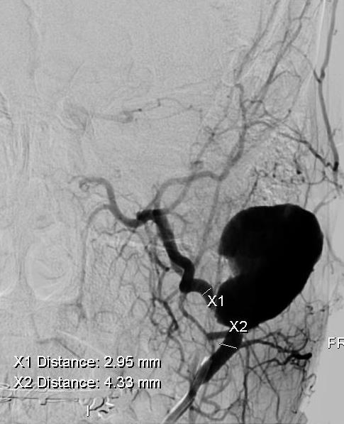 Ryc. 4. Embolizacja tętnicy szyjnej zewnętrznej. Brak przepływu krwi w tętniaku.