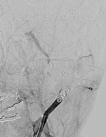 W dalszym etapie z nakłucia tętnicy udowej mikrocewnikiem przez tętnicę szyjną zewnętrzną dotarto do tętnicy szczękowej. Następnie za pomocą tytanowej sprężyny zamknięto odcinek dystalny tętnicy szczękowej (ryc. 3).
